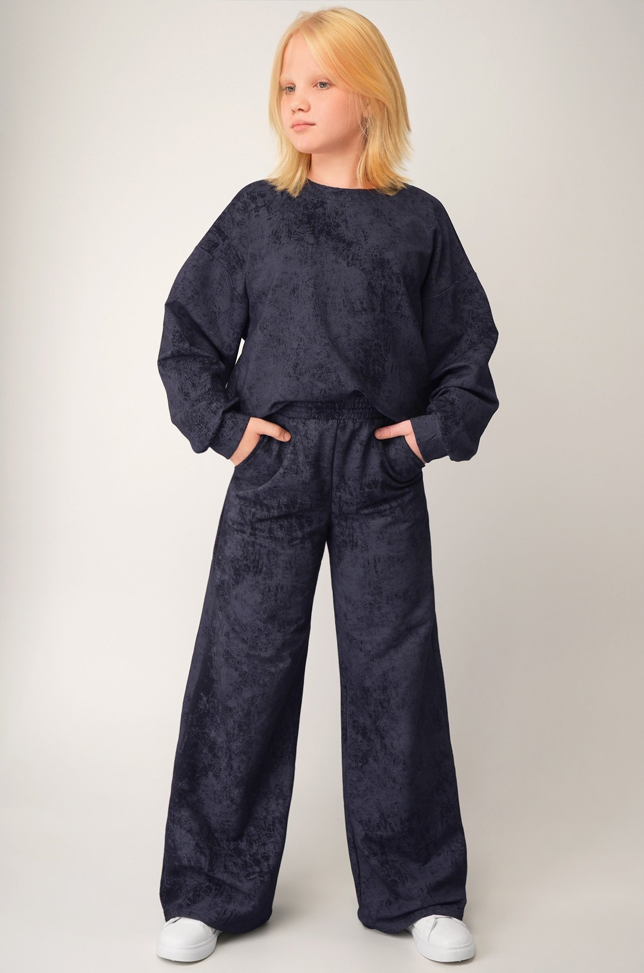 Детский костюм для девочки и девочки подростка с вареным эффектом — стиль без усилий. Глубокий тон и свободный силуэт создают выразительный повседневный образ, а плотный футер даёт ощущение уюта в прохладную погоду.