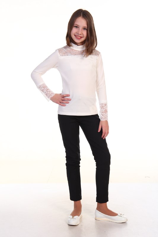 Красивая водолазка для девочки из мягкого хлопка с лайкрой. Кружевная кокетка спереди и манжеты выполнены из кружева высокого качества, что придаёт модели лёгкости.