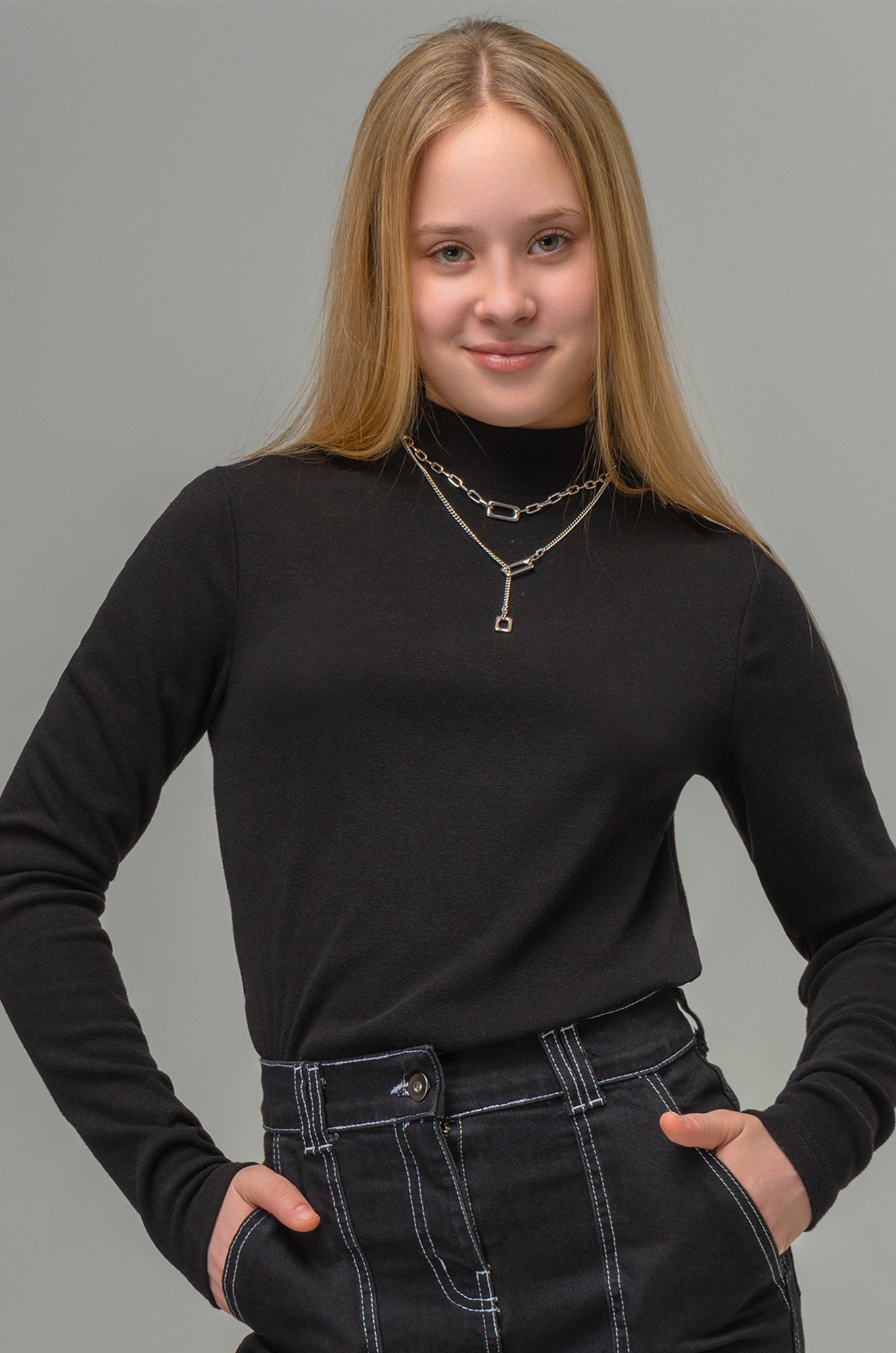 Длинные рукава и воротник-стойка прекрасно защищают в прохладные дни, а рубчик добавляет изящности. Однотонная черная водолазка легко сочетается с другими предметами школьного гардероба, что позволяет создавать новые стильные образы.