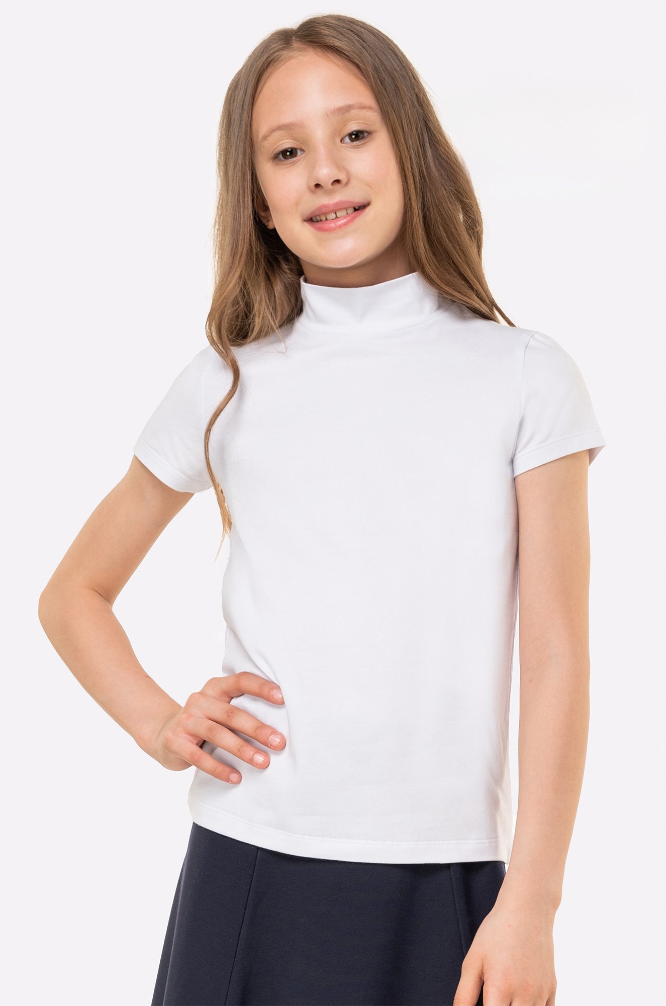 Детская белая водолазка для девочек и девочек подростков выполнена из натурального хлопка с лайкрой. Лёгкая ткань кулирная гладь дарит нежные прикосновения. Трикотажная модель с коротким рукавом и воротником стойкой станет прекрасным дополнением к школьной форме.