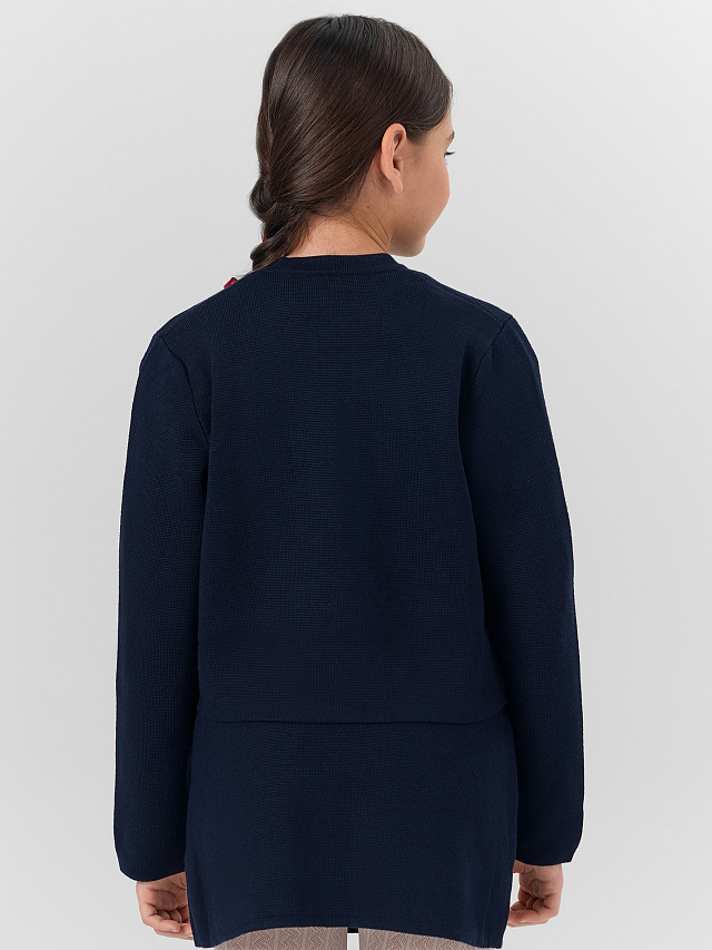 Синий жакет для девочек — элегантная и практичная модель для школьного гардероба. Укороченный прямой крой и длинные рукава создают аккуратный силуэт, который отлично сочетается с широкими брюками, юбками или сарафанами.