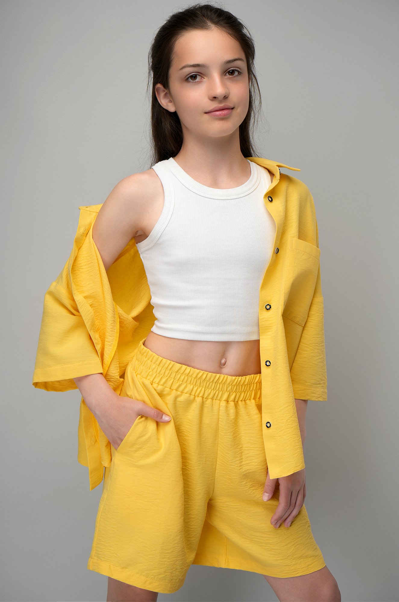 Летний костюм оверсайз для девочки и девочки подростка создан, чтобы покорять с первого взгляда! Желтый костюмчик смотрится свежо и стильно.