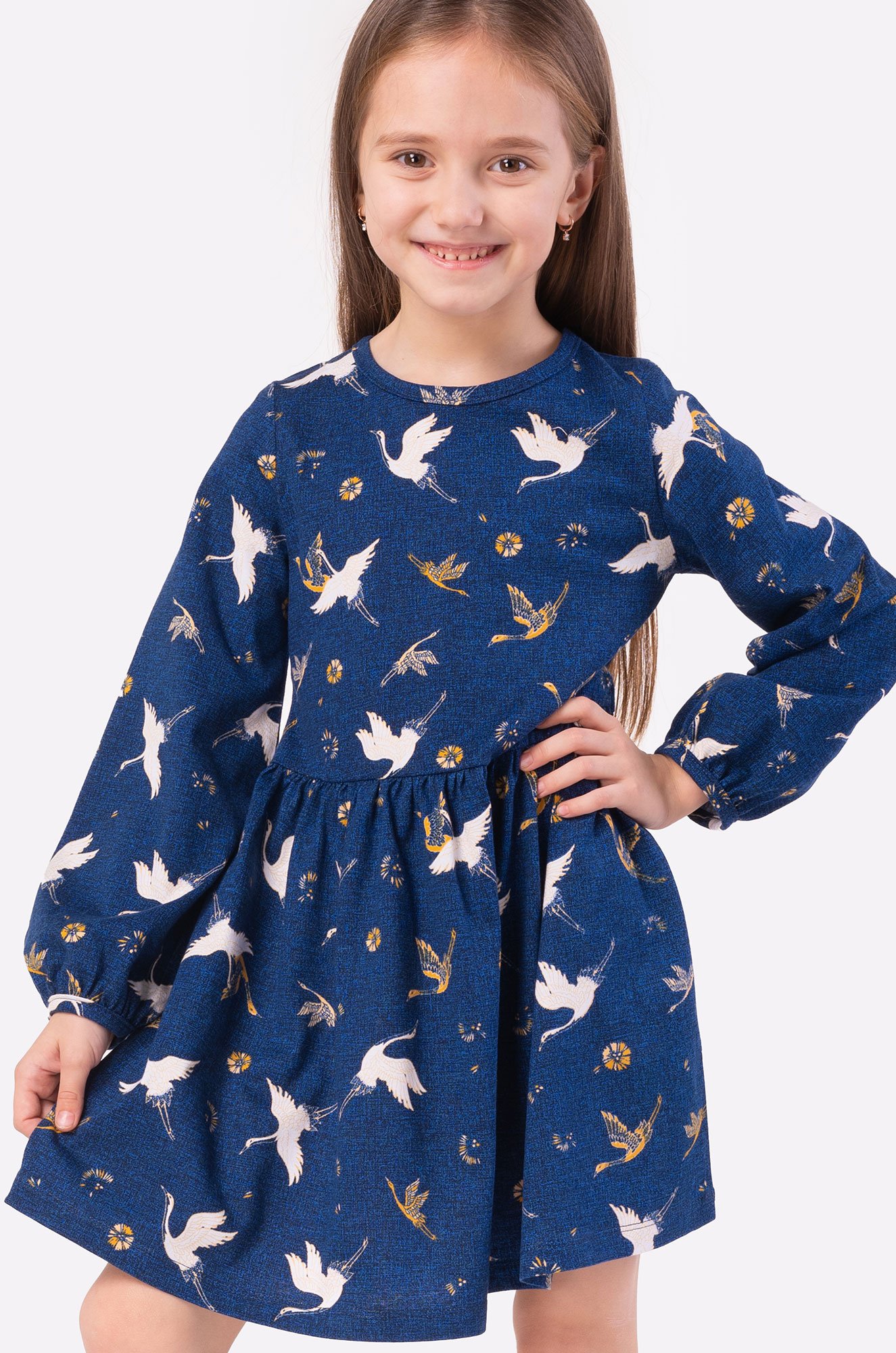 Симпатичное платье для девочек выполнено из 100% хлопкового трикотажа. Легкое платье полуприталенного кроя, круглый вырез горловины, талия на сборочке, длинный рукав. Модель украшена красивым принтом журавли.