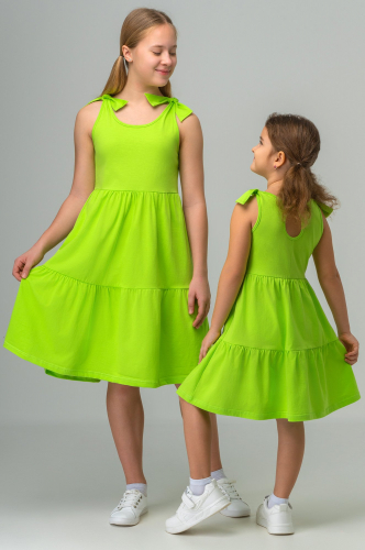 Нарядное платьице выполнено из легкой трикотажной ткани кулирная гладь, которая делает его идеальным для летней погоды, теплой весны и осени. Платье отлично выдерживает частые стирки и будет радовать ребенка не один сезон.