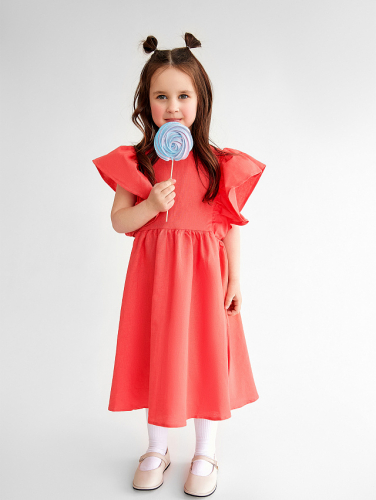 Платье А-силуэта. Спинка и перед цельнокройные. Вырез горловины круглый. По спинке застежка-капелька на одну петлю WT4-6 и пуговицу d=10mm. Вдоль верхней части проймы рукава расположено три слоя рюш, которые переходят с переда на спинку. Подкладка из трикотажного кулирного полотна.