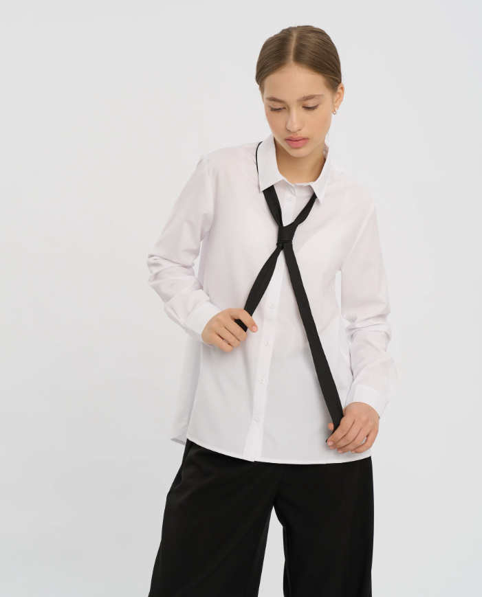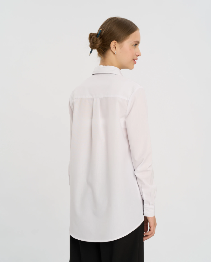 Рубашка для девочки школьная белая сделана из смесового материала с вискозой в составе. Модель из школьной коллекции дышащая, прочная, средней плотности - слегка просвечивается. Блуза удобная для носки в течение всего дня за счет расслабленного кроя, разрезов по бокам и защипа на спине. Рубашка школьная для девочки застегивается на пуговицы. Фишка модели – удлиненная спинка, благодаря чему рубашка отлично смотрится навыпуск и в заправленной стилизации. Сорочка в белом цвете подойдет для учебы, праздников, прогулок и похода в гости. Соответствует ГОСТу.