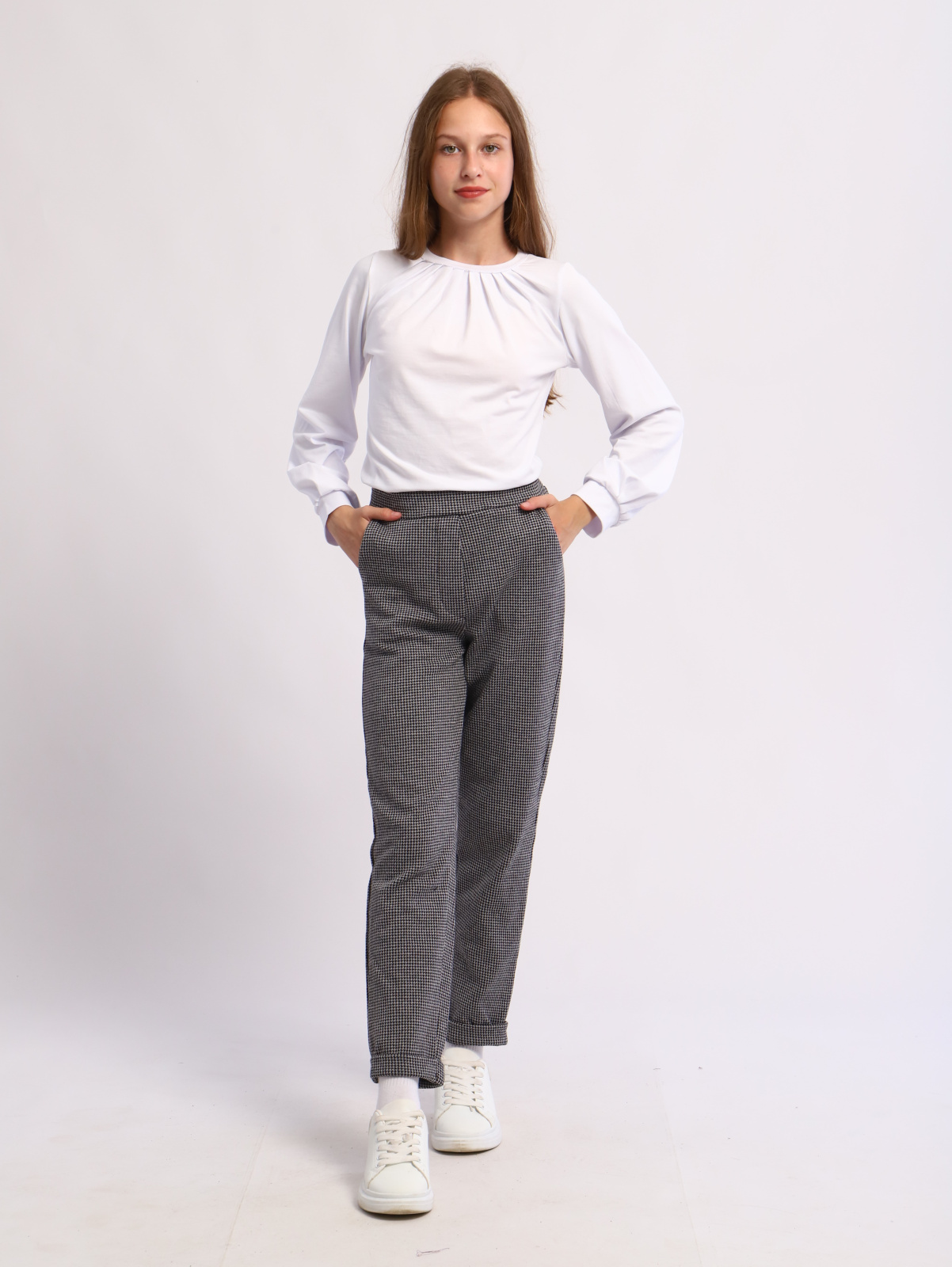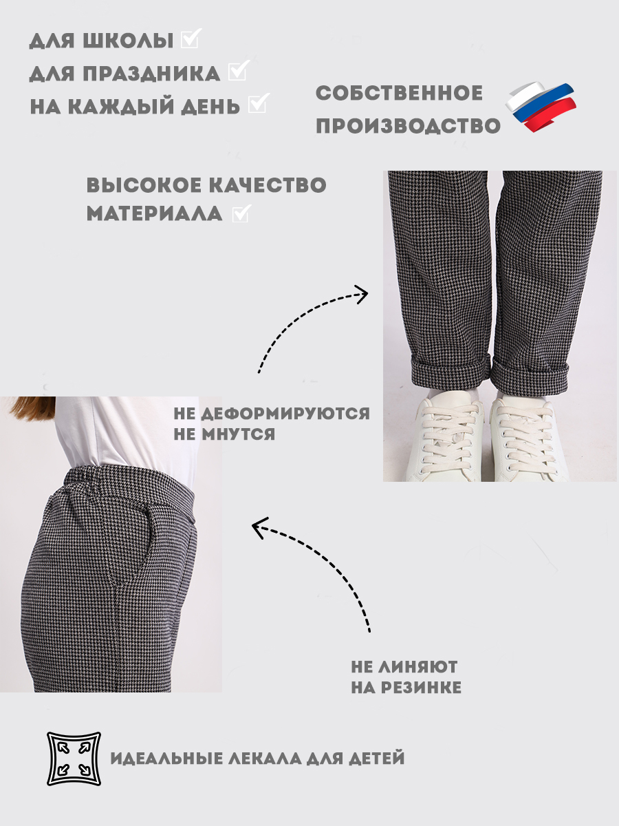 Расцветка "гусиная лапка"сочетается как со спортивным стилем так и с классическим. Подходят в качестве школьной формы. Девушки следят за модными трендами. Клетка неоспоримый лидер среди модных дизайнов одежды для школы. Зауженная к низу модель детских штанов подойдет для прогулок.Брюки на резинке для девочки удобны, трикотаж за счет эластичности не стесняет движений. Активные занятия в этих трикотажных штанах будут комфортными.