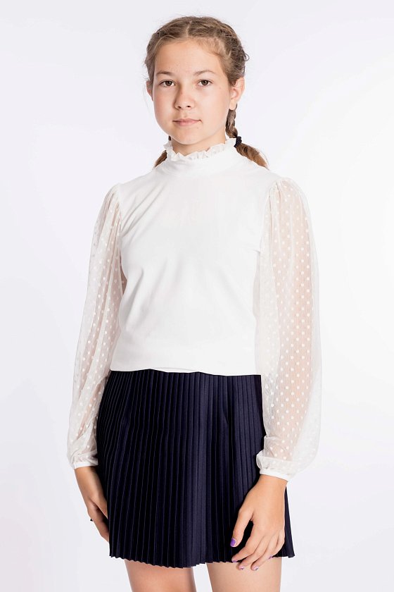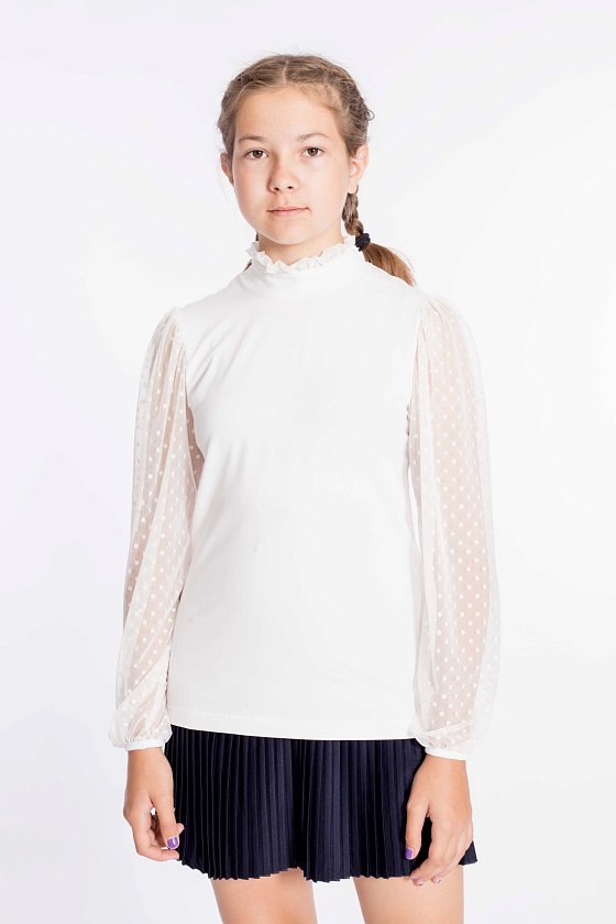 Джемпер выполнен из хлопкового полотна с лайкрой. Воротник-стойка, сзади "капля" с  застёжкой на пуговицу. Длинные рукава и оборка по краю воротника выполнены из кружева.