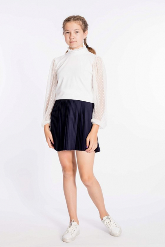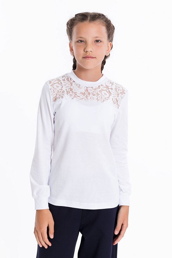 Джемпер из однотонной кулирки с лайкрой. Кружевная кокетка на полочке в цвет основного полотна. Рукав втачной с притачной манжетой. Горловина с притачной планкой.