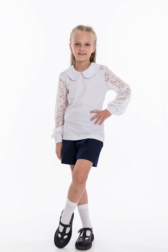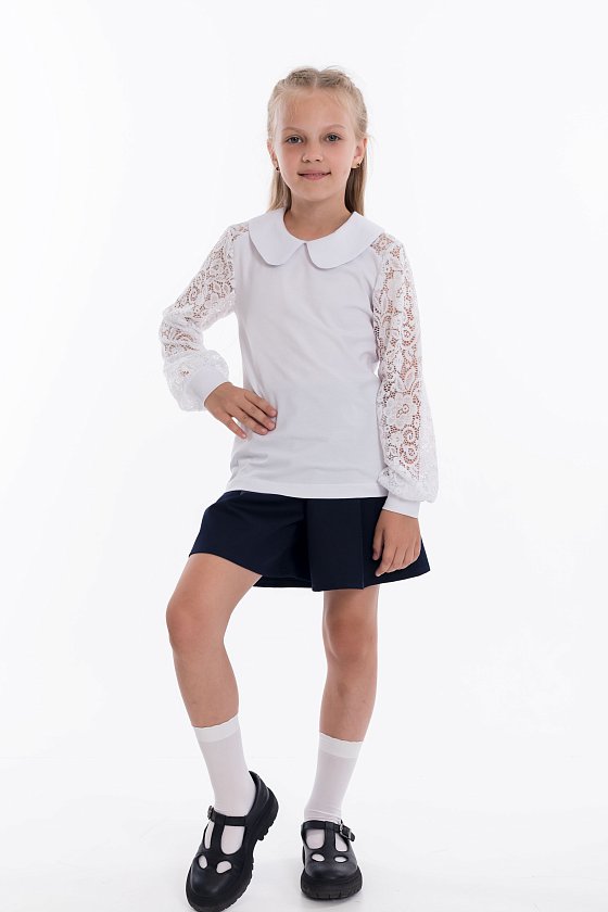 Белый джемпер с длинными кружевными  рукавами — стильный  выбор для школьницы. Изготовлен из материала кулирка с лайкрой, обеспечивает комфорт и свободу движений. Круглый воротник и манжеты из основного материала придают изделию аккуратный вид.