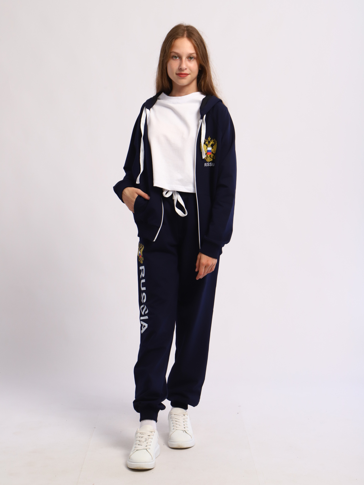 Детский спортивный костюм для мальчика с гербом сшит для подростков. Куртка спортивного костюма для девочки на молнии. с капюшоном, на груди герб России (РФ). С портивный костюм для девочки с брюками с манжетами внизу, с поясом на резинке и шнурком для фиксации на талии, на правой ноге крупная надпись "RUSSIA". Спортивный костюм для подростка мальчика сшит из тонкого без начеса трикотажа для весны и лета. Удобен для тренировок и в помещении и на свежем воздухе. Отличается подростковый комплект-двойка своим стильным и в то же время сдержанным дизайном и удобством. Посадка штанишек средняя, удобная. Модная и функциональная олимпийка с большим объемным капюшоном, может использоваться в качестве отдельного верха на лето . Рукава костюма спортивного для мальчика - реглан. Спереди карманы "Кенгуру". Костюм детский спортивный прекрасно подойдет для активных занятий физкультурой в школе и игр, для путешествий и туристических походов. Превосходен для командных игр и тренировок, на летний и весенний сезон, теплую осень. Спортивный костюм для физкультуры может использоваться не толька как форма. Его удобно носить и повседневно, если ребенок предпочитает спортивный стиль. Натуральный состав - это еще одно преимущество комплекта одежды, ведь он гарантирует комфорт и практичность. Шольный тренировочный комплект для занятий физкультурой в спортивном зале - практичный, немаркий. Подойдет трикотажный костюм и высоким школьникам.! Это прекрасный полезный подарок активному мальчику или девочке!