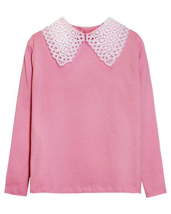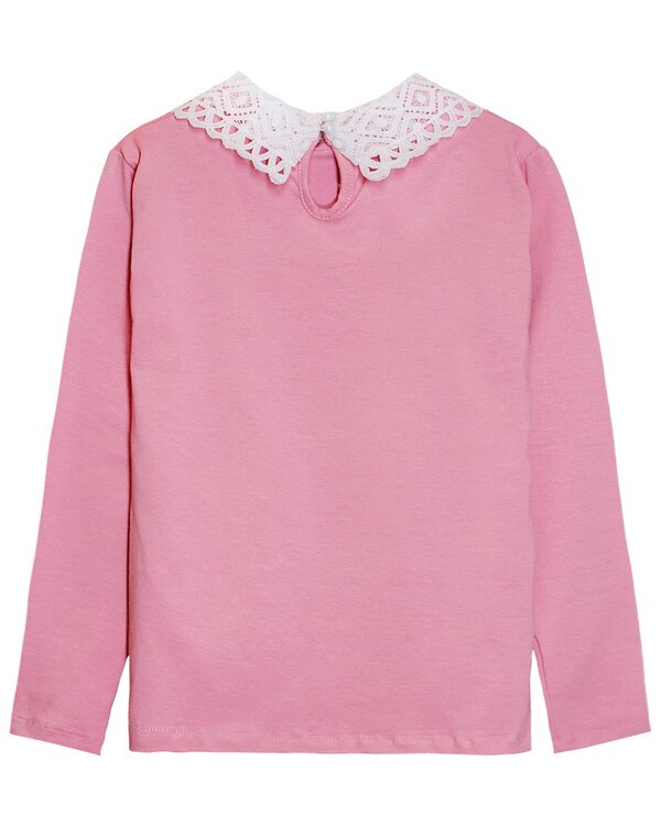 Джемпер для девочки прямого покроя, с втачным длинным рукавом. Горловина круглая, с отложным воротником из кружева. Низ изделия и рукава обработан швом в подгибку.