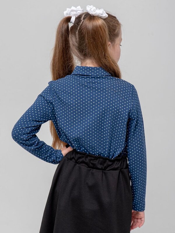 Джемпер для девочки прямого кроя, с втачным длинным рукавом. Горловина круглая, обработана классическим воротником со стойкой из основного полотна. На стойке 1 пуговица на ножке и прорезная петля. На полочке выполнена планка с 3 пуговицами на ножке и прорезными петлями. В шве соединения планки с полочкой выполнена рюша из основного полотна. Край рюши обработан швом "закрутка". Низ изделия и рукавов обработан швом в подгибку.