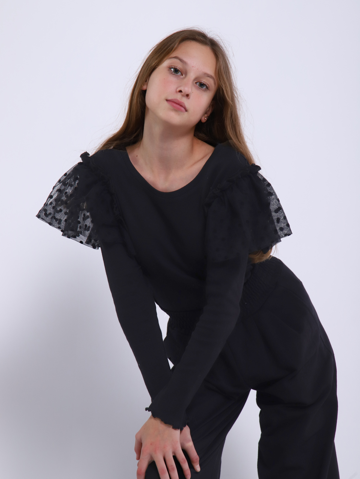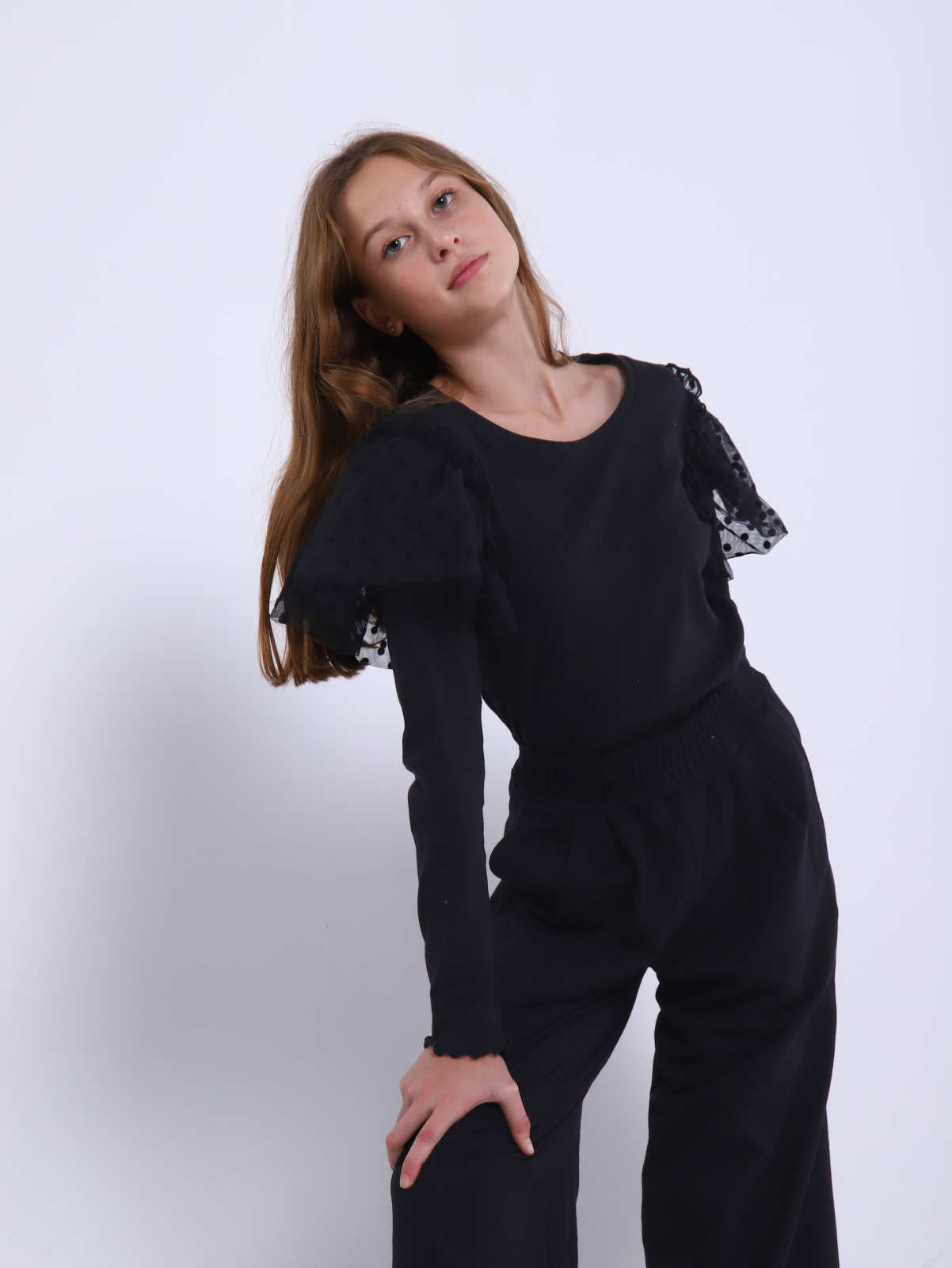 Нарядный подростковый лонгслив-блуза для девочки. Детская блузка сшита из легкого трикотажа с хлопком, ткань в «рубчик» приятная к телу. Рукава отделаны нежным гипюром в виде крылышек, горловина блузки круглая. Блуза отлично сидит на фигуре за счет мягкости и эластичности. Лонгслив можно сочетать со многими предметами гардероба, создавая стильные современные образы, использовать в качестве нарядной одежды на праздники и школьные линейки. Кофточку отлично дополнят любые юбки и брюки, шорты для подростка, кюлоты - укороченные брючки, хорошо смотрится в сочетании с сарафанами. Модный свитшот практичен, подойдет для повседневной носки, прогулок, официальных встреч, школы, экскурсий, кружков, хорошая идея для подарка девочке на любой праздник. Рекомендуем на торжественные события, такие как 1 сентября, выпускной в школе, праздники, дни рождения. Облегченная кофта для тех, кто ценит удобство трикотажных вещей и любит все красивое!