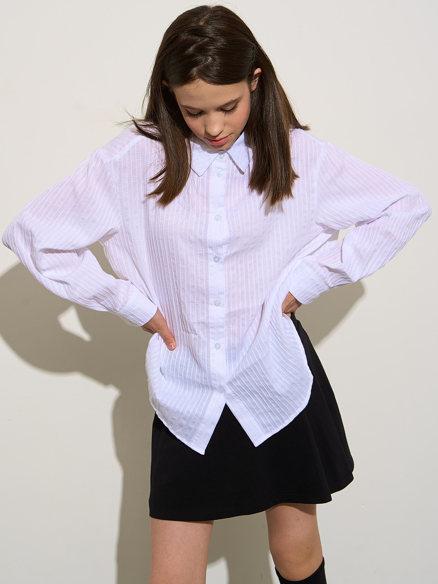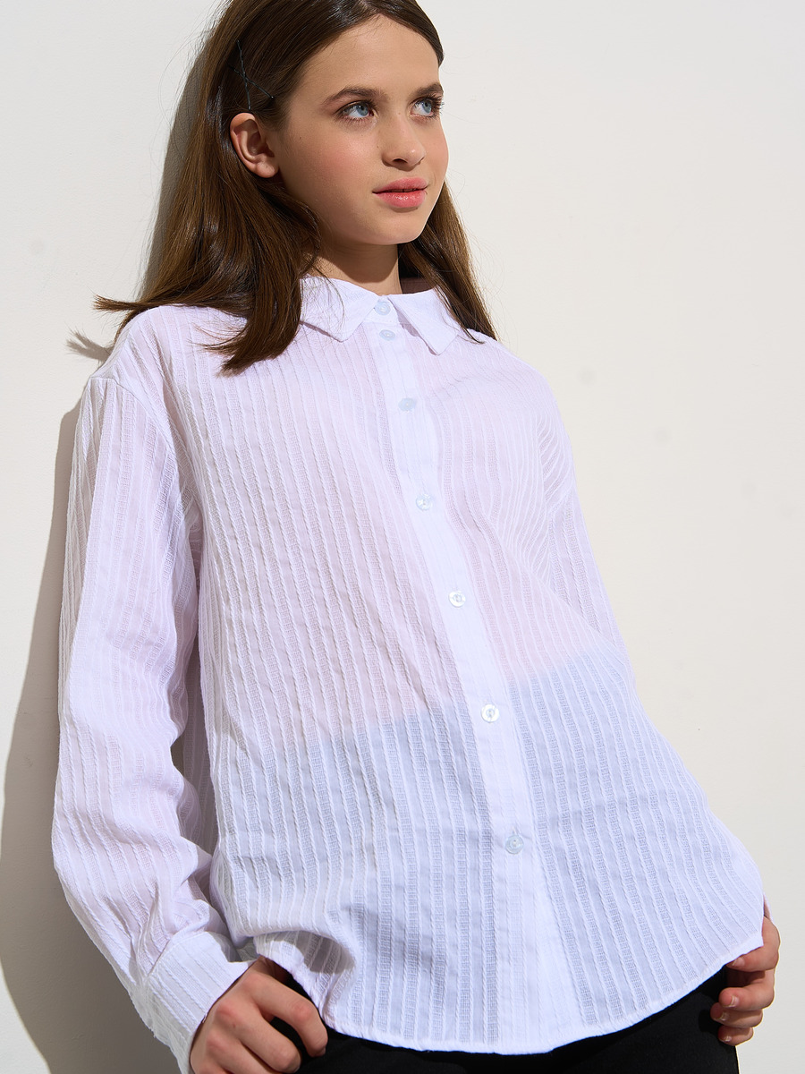 белый Натуральный тонкий батистовый хлопок с фактурным декоративным вертикальным переплетением . Цвет белый. Блузка-рубашка свободного кроя с классическим рубашечным воротником и бантовой складкой по спинке, рукав со спущенным плечом,манжеты на пуговицах.