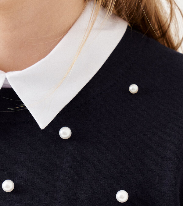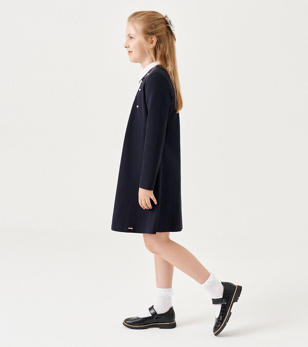 Модное платье для девочки из хлопкового трикотажного полотна со съёмным белым воротничком из смесовой сорочечной ткани. Платье расширенного силуэта, с длинными рукавами, с круглым вырезом горловины, с застежкой на петлю и пуговицу по спинки. По переду платье украшено бусинками. Отличный вариант как в школу, так и для повседневных дней.Размер 30-122: Длина изделия - 63см, Длина рукава - 42.5см, Обхват шеи - 34см, Ширина плеча - 8см, Ширина по груди - 34см, Ширина по талии - 37см, Ширина рукава - 12см;