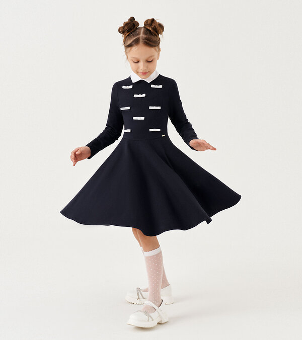 Школьное платье для девочки выполнено из хлопкового трикотажного полотна. Платье со съёмным белым воротничком. Платье отрезное по талии, юбка платье полу солнце. Рукава длинные одношовные. Застежка на петлю и пуговицу по спинки. По переду платье украшено декоративными бантиками с жемчужными бусинками.Размер 30-122: Длина изделия - 67см, Длина рукава - 42.5см, Обхват шеи - 34см, Ширина плеча - 8.5см, Ширина по груди - 33см, Ширина по талии - 32см, Ширина рукава - 12см;