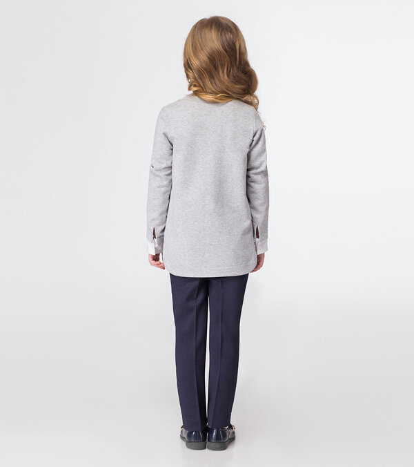 Джемпер для девочки из трикотажного хлопкового полотна в сочетании с белой сорочечной тканью. Джемпер имитирует двухслойность. Джемпер полуприлегающего силуэта, с длинными рукавами с притачными белыми манжетами, с круглым вырезом горловины. Горловина обработана притачной планкой. Передняя часть джемпера имеет фигурный подрез по низу, от подреза вставка из сорочечной ткани .Спинка чуть удлиненная. Джемпер дополнен по переду бусинками разной величины. Такой джемпер отлично сочетается с классическими брюками, создавая строгий образ школьника, или с любимыми джинсами для активного отдыха.Размер 34-146: Длина изделия - 60см, Длина рукава - 52.5см, Ширина плеча - 7см, Ширина по груди - 40см, Ширина по низу - 41см;