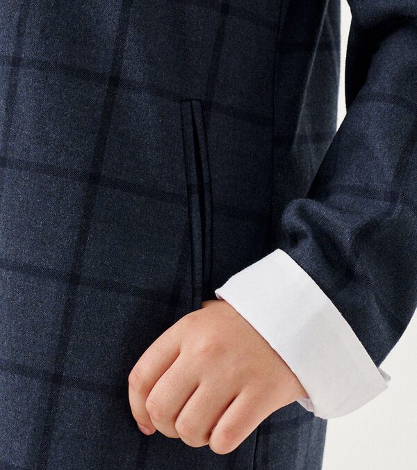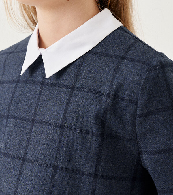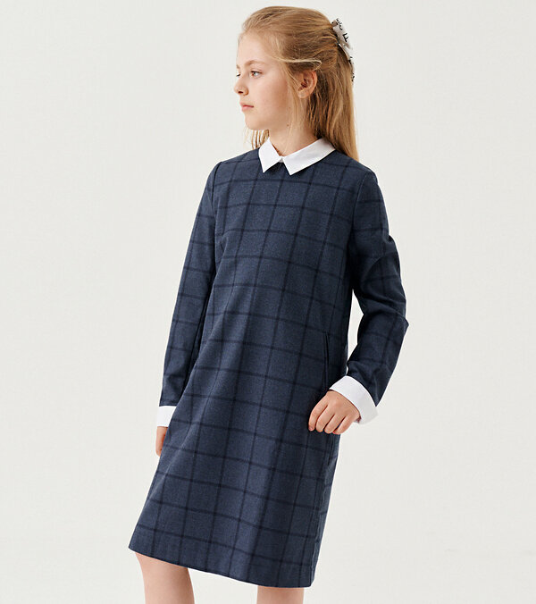 Стильное модное платье для девочки из поливискозной ткани с рисунком в клетку. Передняя часть платья на вискозной подкладки. Платье для девочки полуприлегающего силуэта, с длинным втачным рукавом, со съемным воротничком и манжетами, с застежкой на потайную молнию по спинке. По переду платья имеются боковые карманы. Спинка со средним швом. Воротничок и манжеты съемные на потайных петлях и пуговицах, что обеспечивает практичность. Отличный вариант дресс кода.Размер 30-122: Длина изделия - 62см, Длина рукава - 42.5см, Обхват шеи - 32.5см, Ширина плеча - 8см, Ширина по бедрам - 38см, Ширина по груди - 34см, Ширина рукава - 13см;