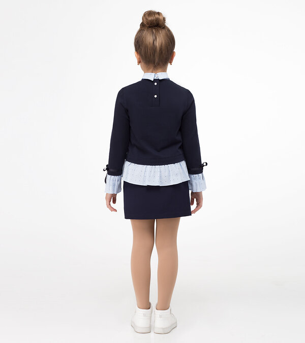 Стильный модный джемпер для девочки из хлопкового трикотажного полотна с отделкой из хлопковой ткани с рисунком. Джемпер прямого силуэта, с сорочечным воротником из хлопковой ткани с рисунком, с застежкой на петли и пуговицы на спинке. Рукава втачные длинные, по низу рукава притачен манжет из хлопковой ткани с рисунком. Над манжетами настрочена атласная лента, которая завязывается в декоративный бантик. По переду джемпер украшен бусинками. Джемпер отлично сочетается как с брюками, так и с юбками. Такой джемпер станет прекрасным выбором школьника.Размер 34-140: Длина изделия - 53см, Длина рукава - 51см, Обхват шеи - 35см, Ширина плеча - 9.5см, Ширина по груди - 38см, Ширина по низу - 39см, Ширина рукава - 13см;