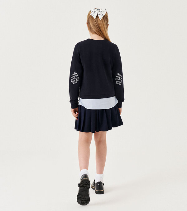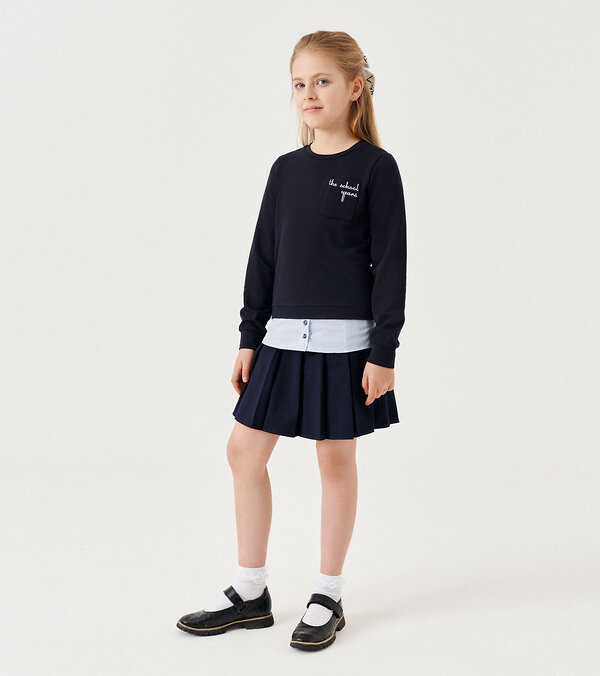 Стильный джемпер для девочки из трикотажного хлопкового полотна с имитацией втачной рубашки. Джемпер полуприлегающего силуэта, с круглым вырезом горловины, с накладным карманом по переду. Джемпер дополнен изящной оригинальной печатью на кармане и на локтях. Отлично подойдет как в школу, так и для будних дней с любимыми джинсами.Размер 30-122: Длина изделия - 47см, Длина рукава - 47.5см, Ширина плеча - 8см, Ширина по груди - 36см, Ширина по низу - 36см, Ширина рукава - 14см;