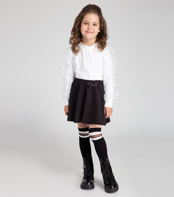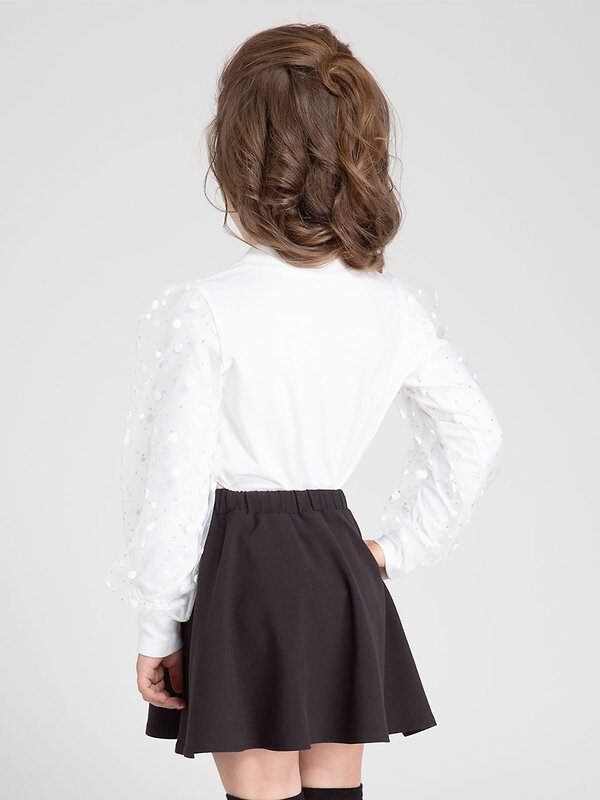 Джемпер для девочки из трикотажного хлопкового полотна. Силуэт джемпера прямой. Длинна джемпера до середины бедра. Горловина джемпера с притачной стойкой. На переде выполнена сборка, расположенная по срезу притачивания стойки к переду. Рукава втачные, длинные, двухслойные. По нижнему срезу рукавов притачаны манжеты. Верхний слой рукава выполнен из декоративной сетки, что придает изделию торжественность. Нижний слой рукава выполнен из трикотажного хлопкового полотна. Так же по нижней части переда расположен декоративный элемент - металлическая лейба. Джемпер станет изюминкой гардероба маленькой модницы. Эта модель отлично подойдет как для ежедневной носки в учебное заведение, так и для торжественных случаев.Размер 30-122: Длина изделия - 44см, Длина рукава - 45см, Ширина плеча - 5.5см, Ширина по груди - 34см, Ширина по низу - 34см, Ширина рукава - 18.5см;
