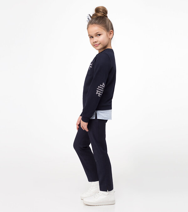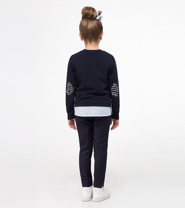 Стильный джемпер для девочки из трикотажного хлопкового полотна с имитацией втачной рубашки. Джемпер полуприлегающего силуэта, с круглым вырезом горловины, с накладным карманом по переду. Джемпер дополнен изящной оригинальной печатью на кармане и на локтях. Отлично подойдет как в школу, так и для будних дней с любимыми джинсами.Размер 30-122: Длина изделия - 47см, Длина рукава - 47.5см, Ширина плеча - 8см, Ширина по груди - 36см, Ширина по низу - 36см, Ширина рукава - 14см;