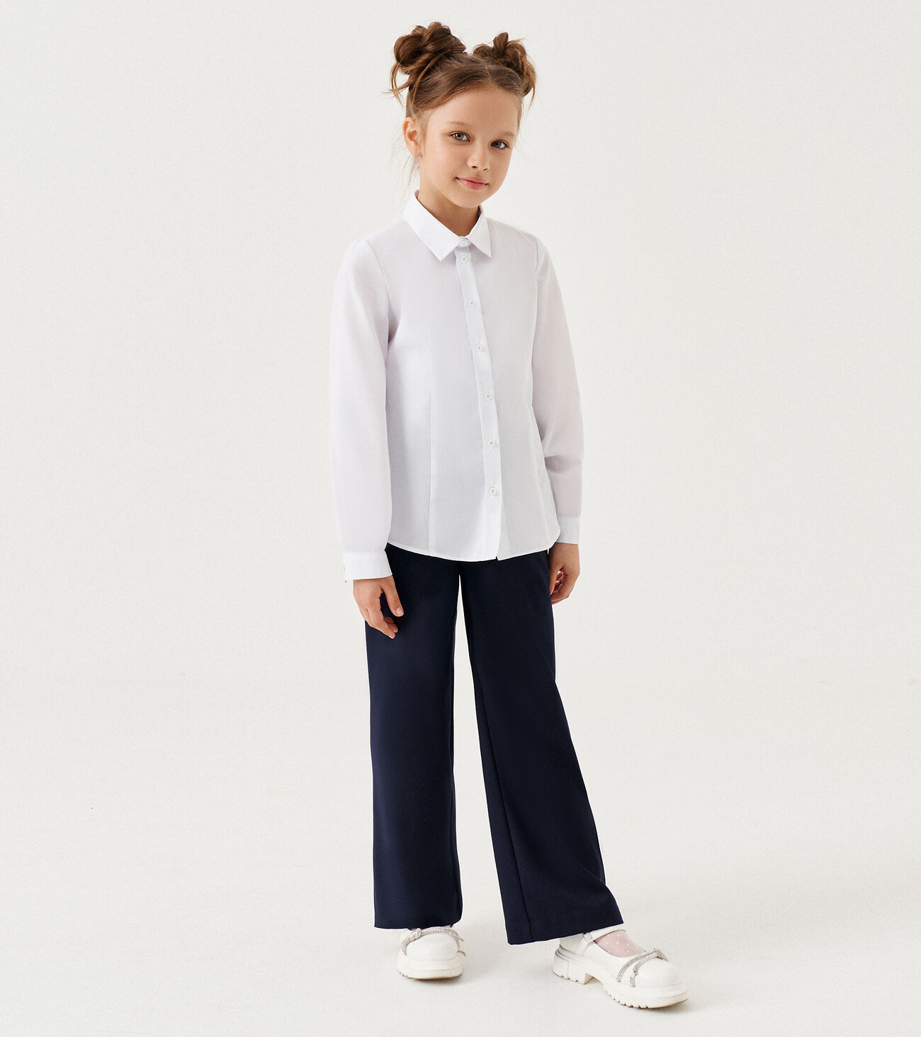 Блуза для девочки из хлопковой ткани для повседневной носки. Блуза полуприлегающего силуэта с длинным рукавом, фронтальной застежкой на пуговицы, воротником- стойкой. По переду и спинке талиевые вытачки. Длина изделия классическая.Размер 30-122: Длина изделия - 45см, Длина рукава - 44см, Обхват шеи - 37.5см, Ширина плеча - 7.5см, Ширина по груди - 36см, Ширина по низу - 39см, Ширина рукава - 14см;