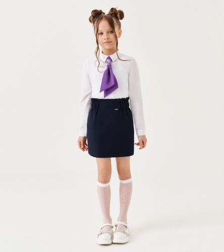 Жакет для девочки полуприлегающего силуэта с центральной застежкой на три петли и пуговицы, с V-образным вырезом горловины, с втачными рукавами. Перед жакета с рельефными швами, идущими от проймы до низа, с передними вытачками и боковыми прорезными карманами с листочкой. На листочках имеются декоративные бантики. Спинка со средним швом и рельефными швами, идущими от плечевых швов до низа изделия. Рукава втачные двухшовные. Локтевые швы заканчиваются закрытыми шлицами с декоративными пуговицами. Воротник отложной пиджачного типа. Жакет с притачной по низу подкладкой.Размер 44-170: Длина изделия - 69см, Длина рукава - 62см, Ширина плеча - 12.5см, Ширина по груди - 53см, Ширина по низу - 55см, Ширина рукава - 18см;