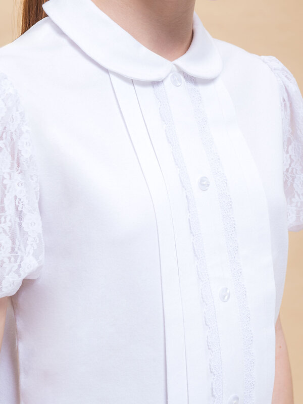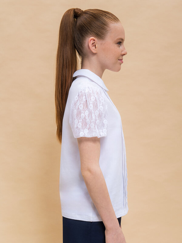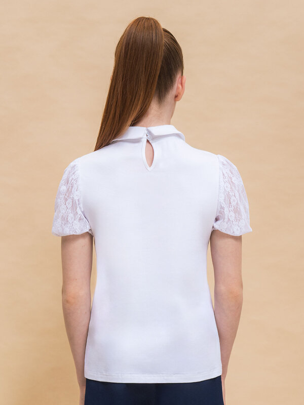 Джемпер из мягкого хлопкового трикотажа с небольшим содержанием эластана, полуприлегающего силуэта, с отложным круглым воротником на цельнокроеной стойке. По центру переда планка с декоративными пуговицами, вдоль которой застрочены вертикальные складки и кружево с фестонным краем. По спинке застежка на две пуговицы. С коротким объёмным рукавом на подкладе из тонкой сетки. По низу рукав присборен на шпульную резину.