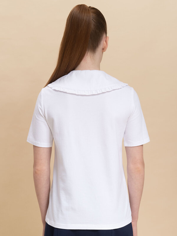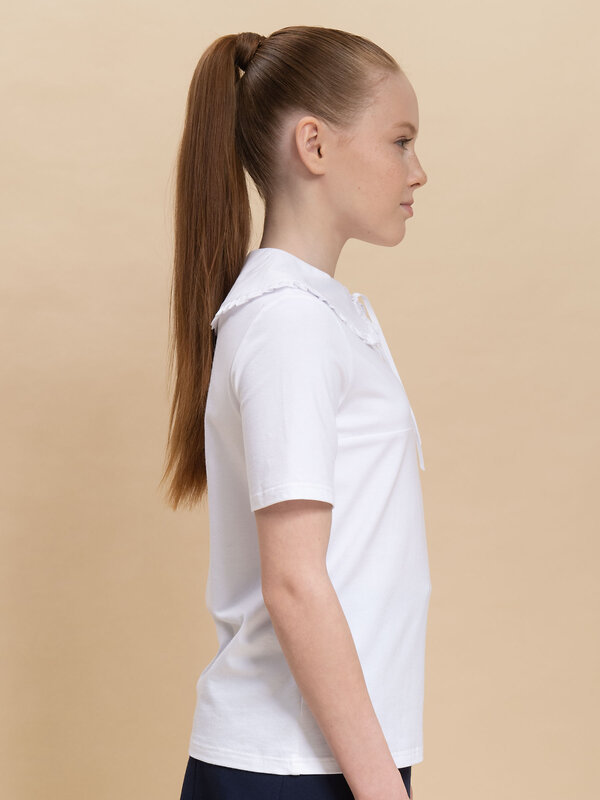 Школьная блузка для девочки. Комфортная трикотажная блузка умеренного объёма хорошо садится на девочек с разной фигурой и не сковывает движений ребёнка. По переду планка с застёжкой на пуговицы — ребёнку удобно надевать и снимать блузку. Модная фишка изделия — большой фигурный воротник из швейной ткани, украшенный рюшем (суперактуальный «воротник Уэнсдэй»). Сзади под воротником пришита узкая декоративная тесьма, которая завязывается спереди на бантик под воротником. Блузка в школу для девочки выполнена из ткани с высоким содержанием качественного хлопка — ребёнку не жарко, кожа дышит. Благодаря полиамиду в составе материала блузка детская хорошо сохраняет форму и первоначальный внешний вид. Модель однотонная, без принта. В ассортименте представлены блузки для девочек школьные универсальных цветов. Они легко комбинируются с различными брюками, юбками, сарафанами. Такая блузка подходит как для повседневной носки в школу, так и для более торжественного случая — в зависимости от того, с чем её надеть. Идеальный выбор школьной формы для вашей девочки. Помните о правильном уходе за изделием: рекомендуется стирать при температуре не выше 30 °C, без предварительного замачивания, с изнанки. Это поможет сохранить качество и цвет блузки на длительное время. Не забывайте о выборе правильного размера. Используйте таблицу размеров на фотографии, чтобы выбрать подходящий вариант. Обратите внимание, что цвет товара на экране вашего устройства может отличаться от реального.