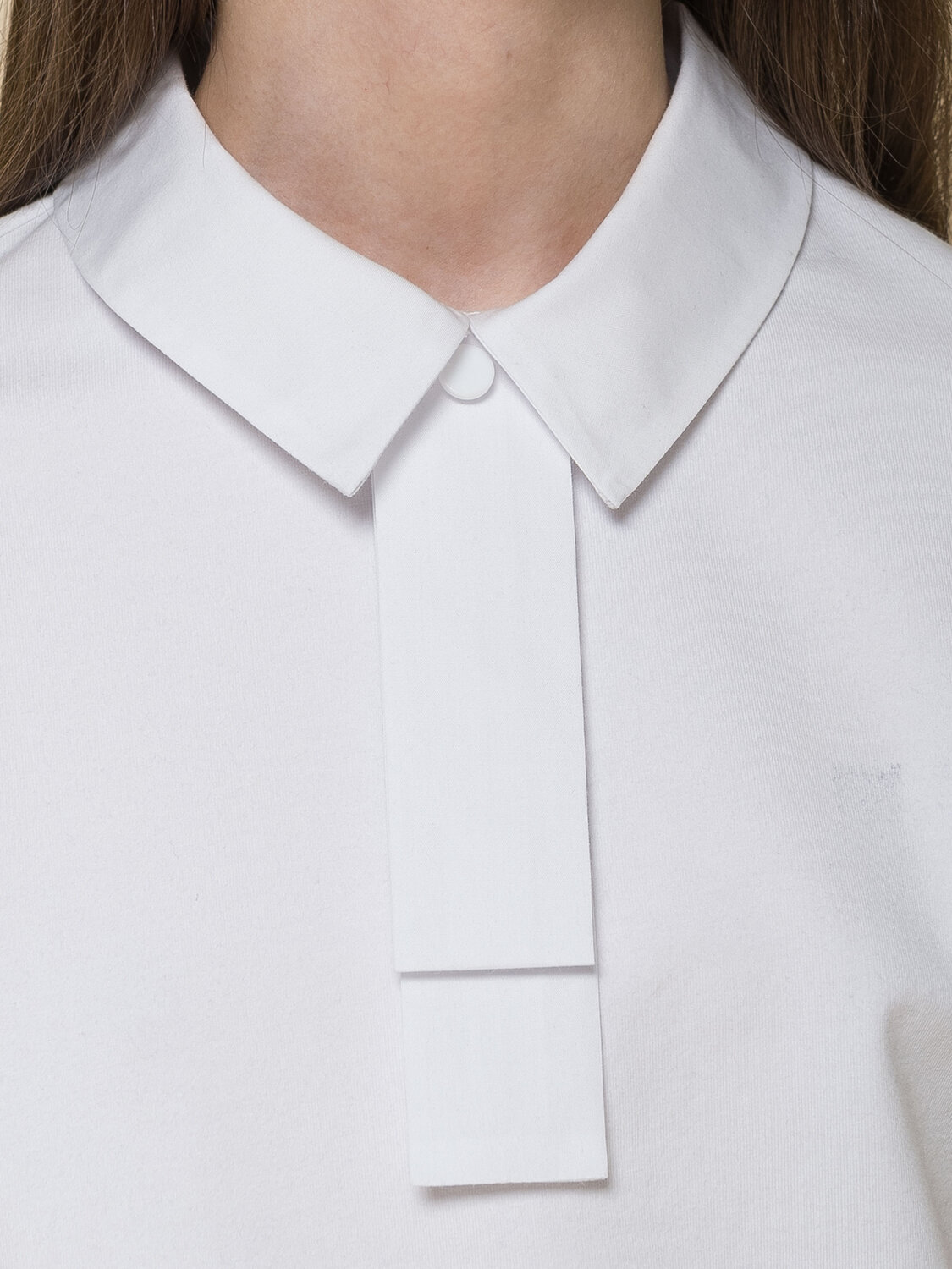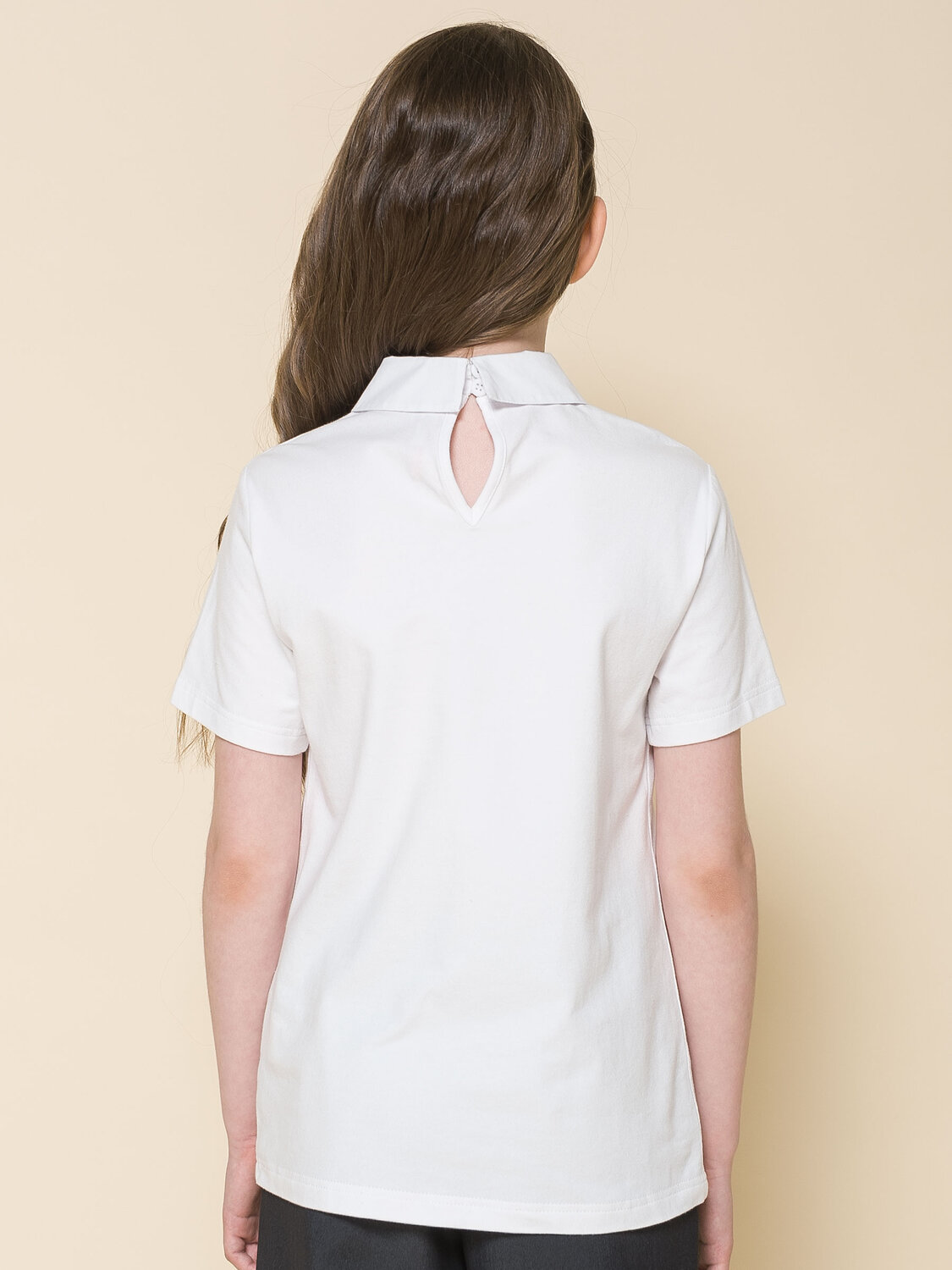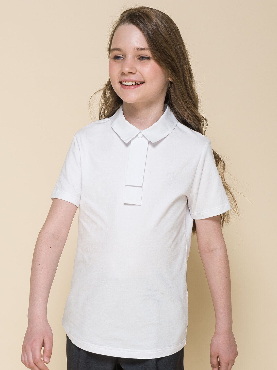 Школьная футболка прилегающего силуэта для девочки. В составе ткани преобладает хлопок — изделие мягкое, дышащее и приятное на ощупь. Эластан помогает сохранять форму и после многочисленных стирок. В футболке комфортно в течение всего дня, ничего не давит, не колет, не сковывает движения. Блузку украшают белый воротничок и декоративно сложенный галстук из швейной ткани с пуговицей в тон — изюминка этой модели. Он позволяет создавать элегантные образы с пиджаком, жилетом, сарафаном. Модель застёгивается сзади на пуговицу с петлёй из резинки — ребёнку удобно её застёгивать и расстёгивать. Универсальный вариант школьной одежды — подойдёт как для повседневной носки, так и для более торжественного случая.