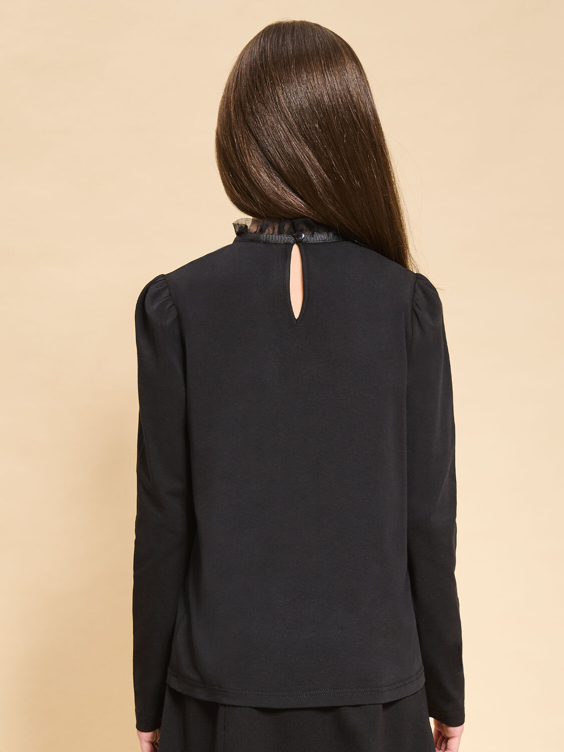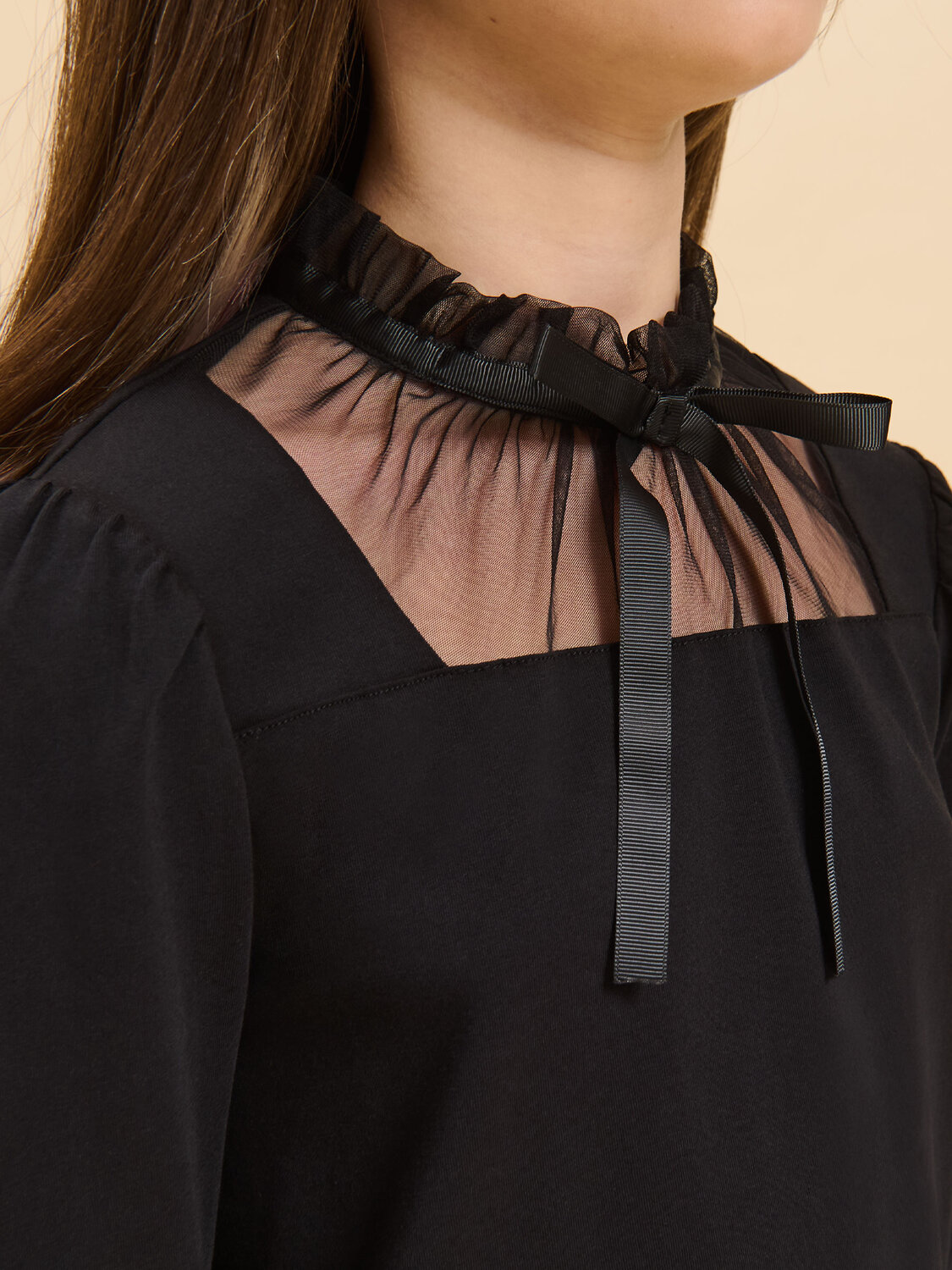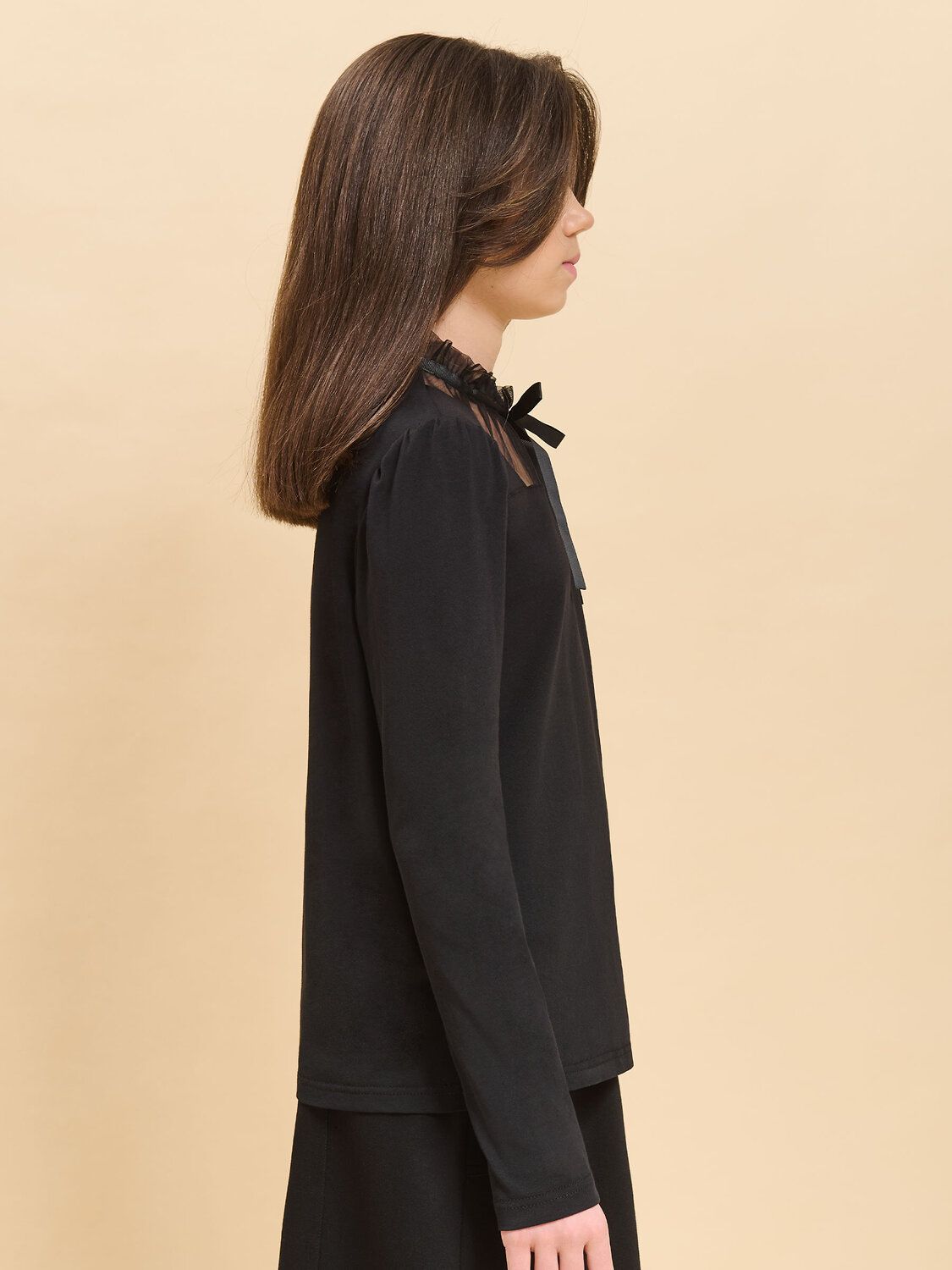 Джемпер с длинным рукавом, со сборкой по окату. Из мягкого хлопкового трикотажа с небольшим содержанием эластана, полуприлегающего силуэта с декоративной вставкой и рюшей по горловине из мягкой тонкой сетки. На горловину настрачивается репсовая лента, имитирующая миниатюрную стойку, на переде которой завязанный бант. По спинке застежка на пуговицу.