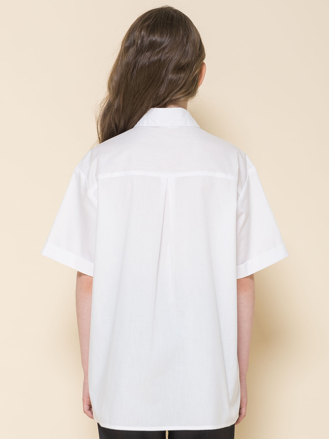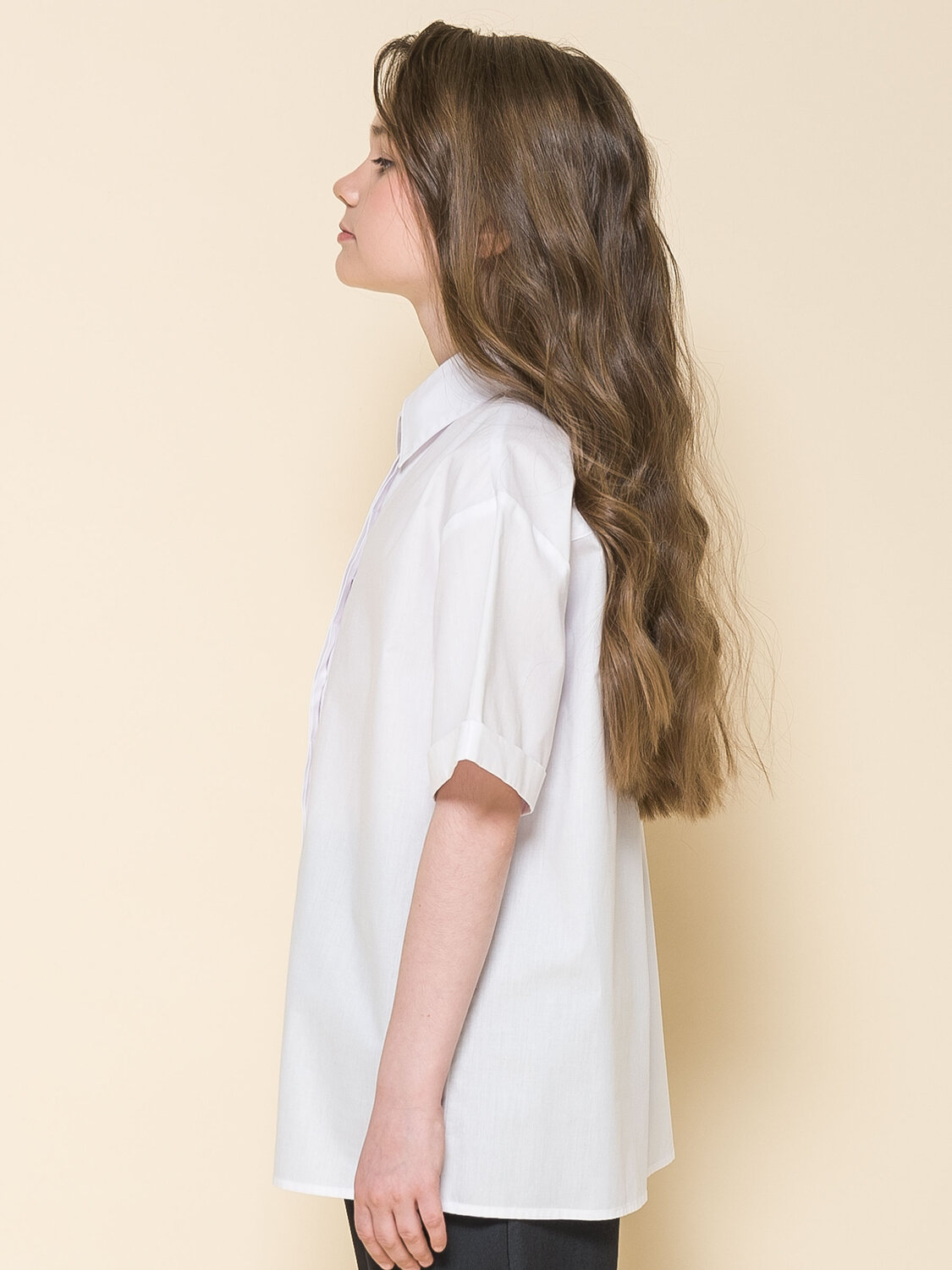 Школьная блузка прямого силуэта для девочки. Преобладающий в составе ткани хлопок делает эту модель мягкой, воздухопроницаемой и комфортной для ребёнка. Полиэстер помогает не терять форму и превосходный внешний вид. На спинке кокетка с защипом — свобода движения, комфорт в течение всего дня. Классическая центральная застёжка на пуговицы скрыта планкой — это придаёт блузке элегантной строгости. Рукав с отворотом - оригинально. Изделие лаконичного дизайна легко сочетать с различными брюками, юбками и джинсами. Красивая и практичная блузка — подходит как для повседневной носки в школу, так и для более торжественных случаев.