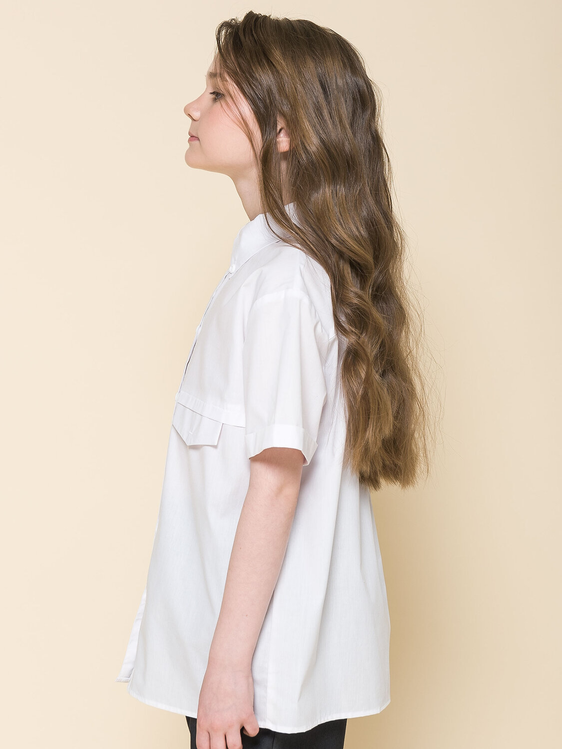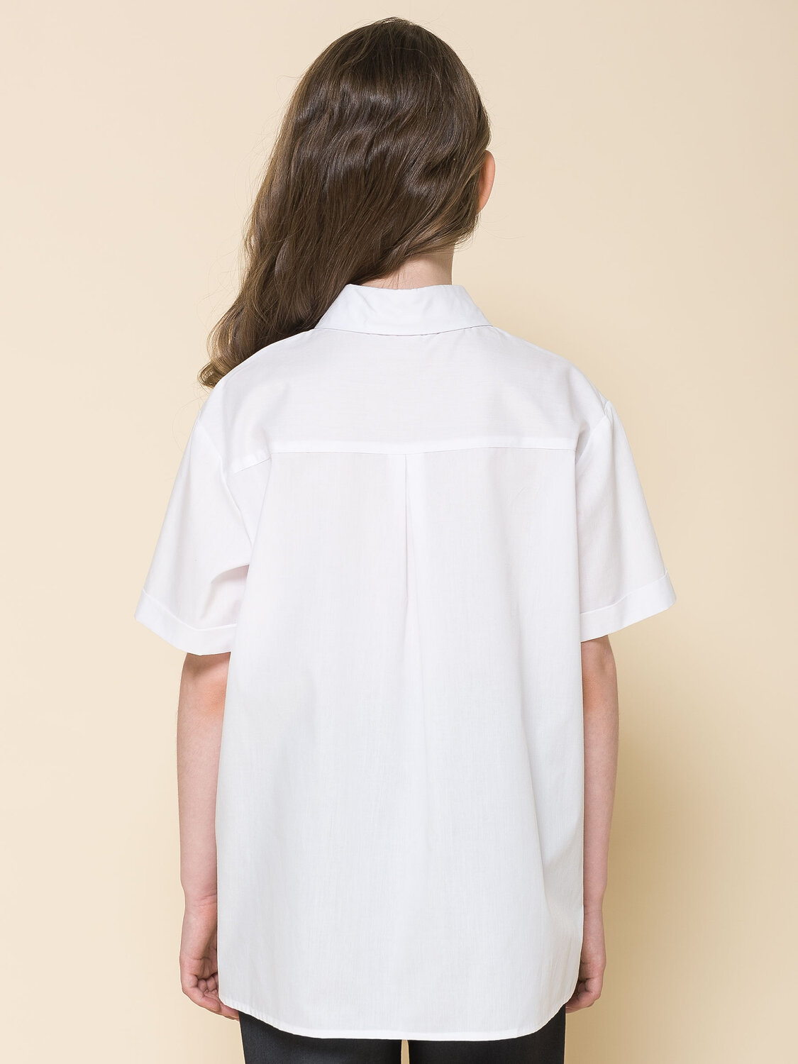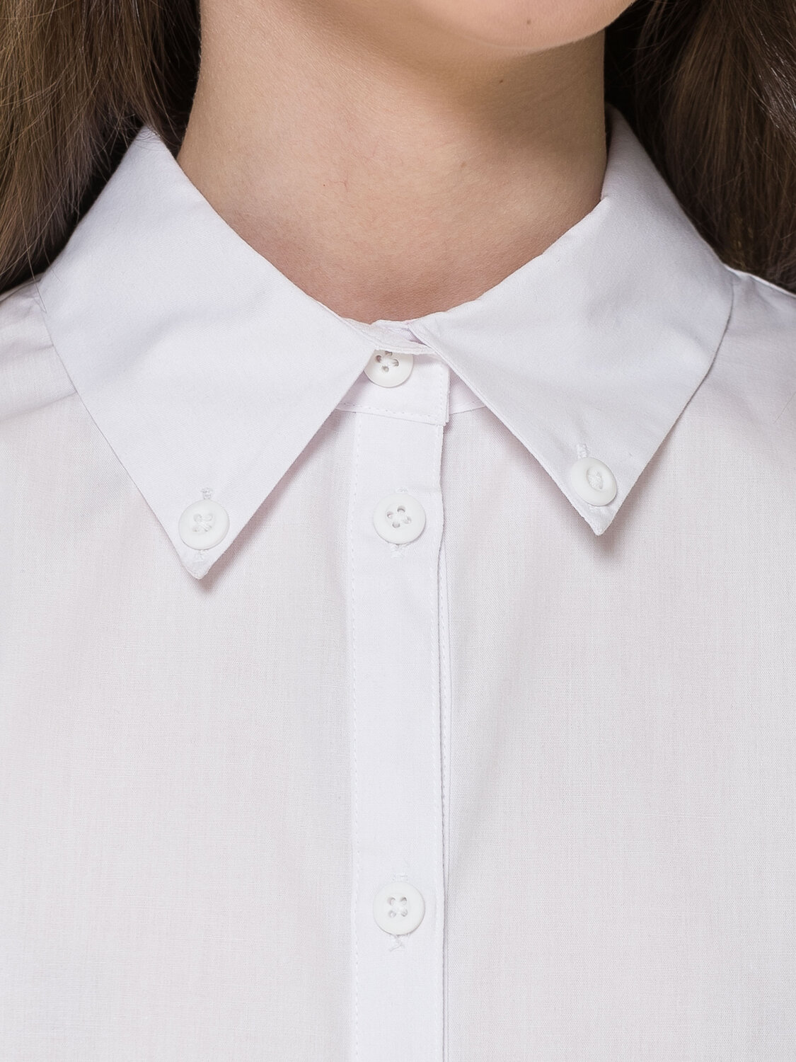 Школьная блузка прямого силуэта для девочки. Преобладающий в составе ткани хлопок делает эту модель мягкой, дышащей и комфортной для ребёнка. Благодаря полиэстеру изделие сохраняет форму и превосходный внешний вид. На спинке кокетка с защипом - свобода движения, комфорт в течение дня. По переду под кокеткой имитация кармана в виде декоративного клапана – актуально и стильно. Воротник украшают декоративные пуговицы — изюминка модели. Рукав с отворотом - оригинально. Практичная и универсальная модель благодаря лаконичному дизайну великолепно сочетается с различными брюками и юбками. Отличный вариант детской блузки для школы.