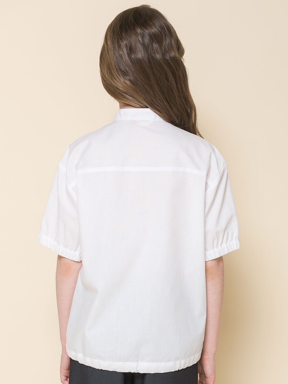 Школьная блузка для девочки. В составе ткани преобладает хлопок — изделие мягкое, дышащее и комфортное. Полиэстер помогает не терять форму и отличный внешний вид. Объемный крой, спущенное плечо – настоящий трендовый оверсайз. Модель с воротником-стойкой застёгивается на пуговицы по переду — ребёнку удобно надевать и снимать блузку через голову. По переду накладной карман с клапаном, который украшает эластичный световозвращающий шнур со стоппером — модно и актуально. В манжетах рукавов широкая внутренняя резинка — не давит и не впивается. По низу внутренний эластичный световозвращающий шнур со стоппером — можно регулировать объём и менять силуэт. На девочках с разными фигурами будет смотреться идеально. Удобно в течение всего дня. Отличный вариант блузки для школы. Идеально белый цвет без желтого и серого оттенка.