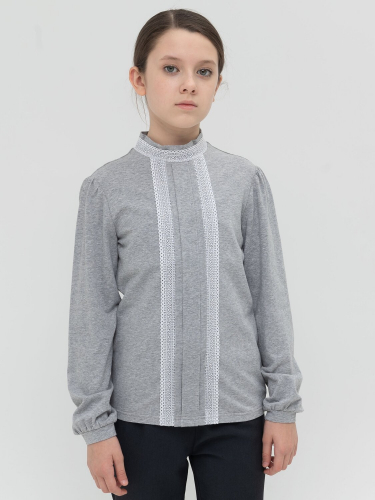 Блузка для девочек полуприлегающего силуэта с рельефами по спинке и переду. Рукав фонарик по низу фиксируется узкой манжетой из декоративной тесьмы. Воротник стойка с рюшей по верхнему краю декорирован съёмной сатиновой тесьмой, которая продета в шлёвки по спинке воротника. Спереди от стойки расходятся декоративные лучи вытачки.