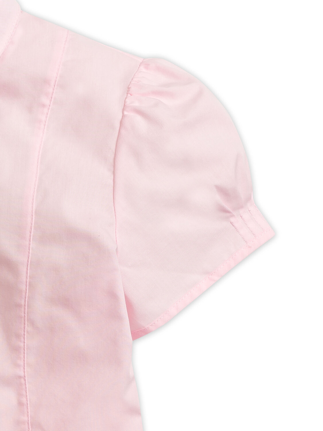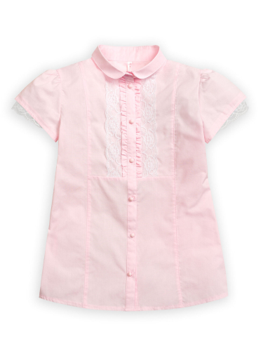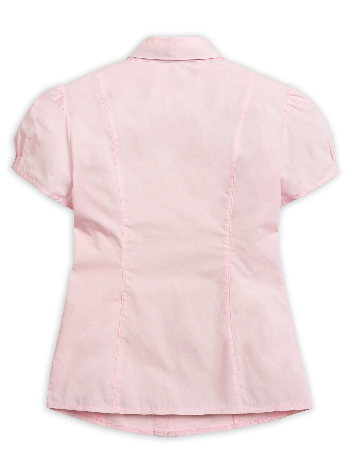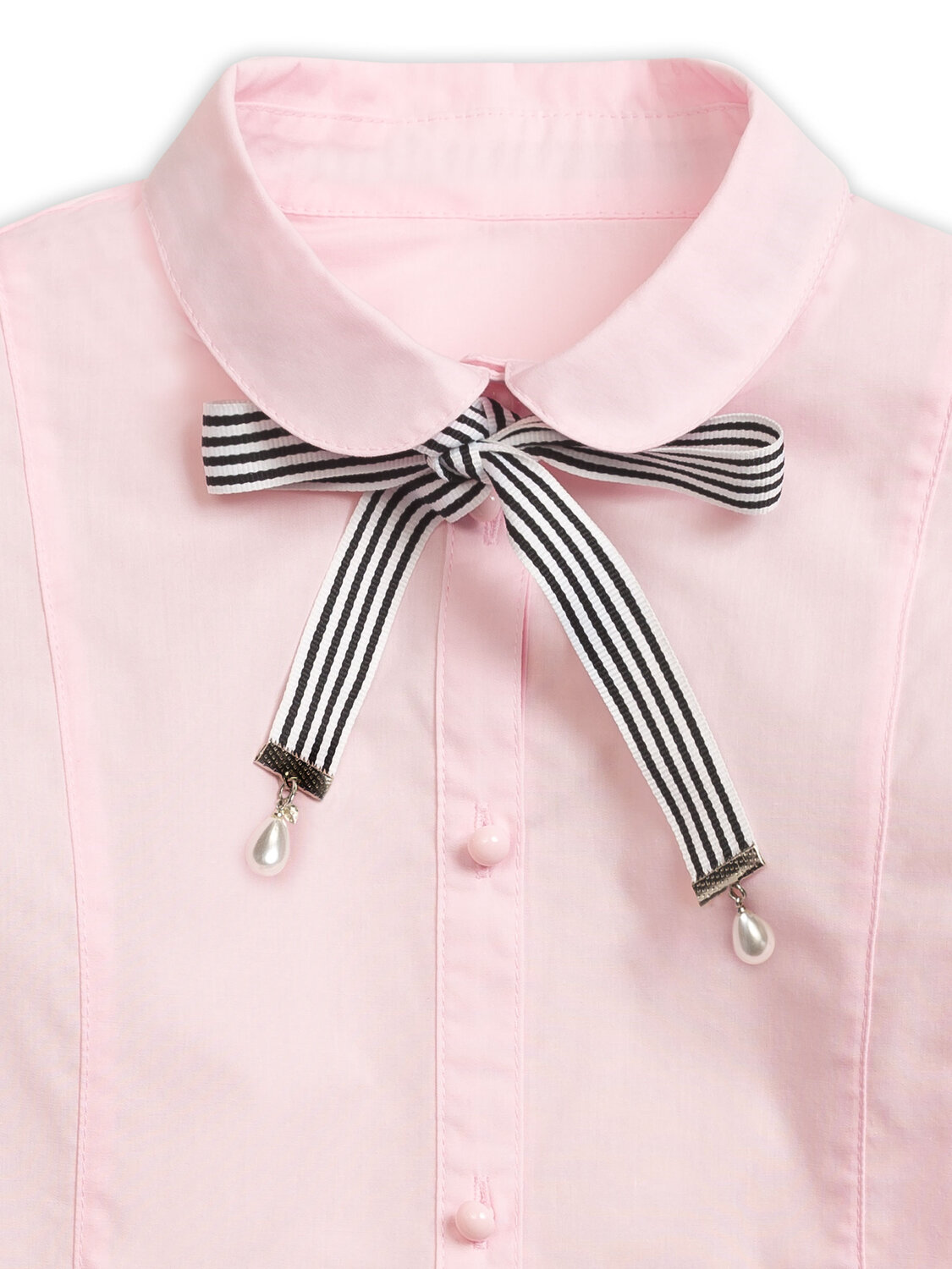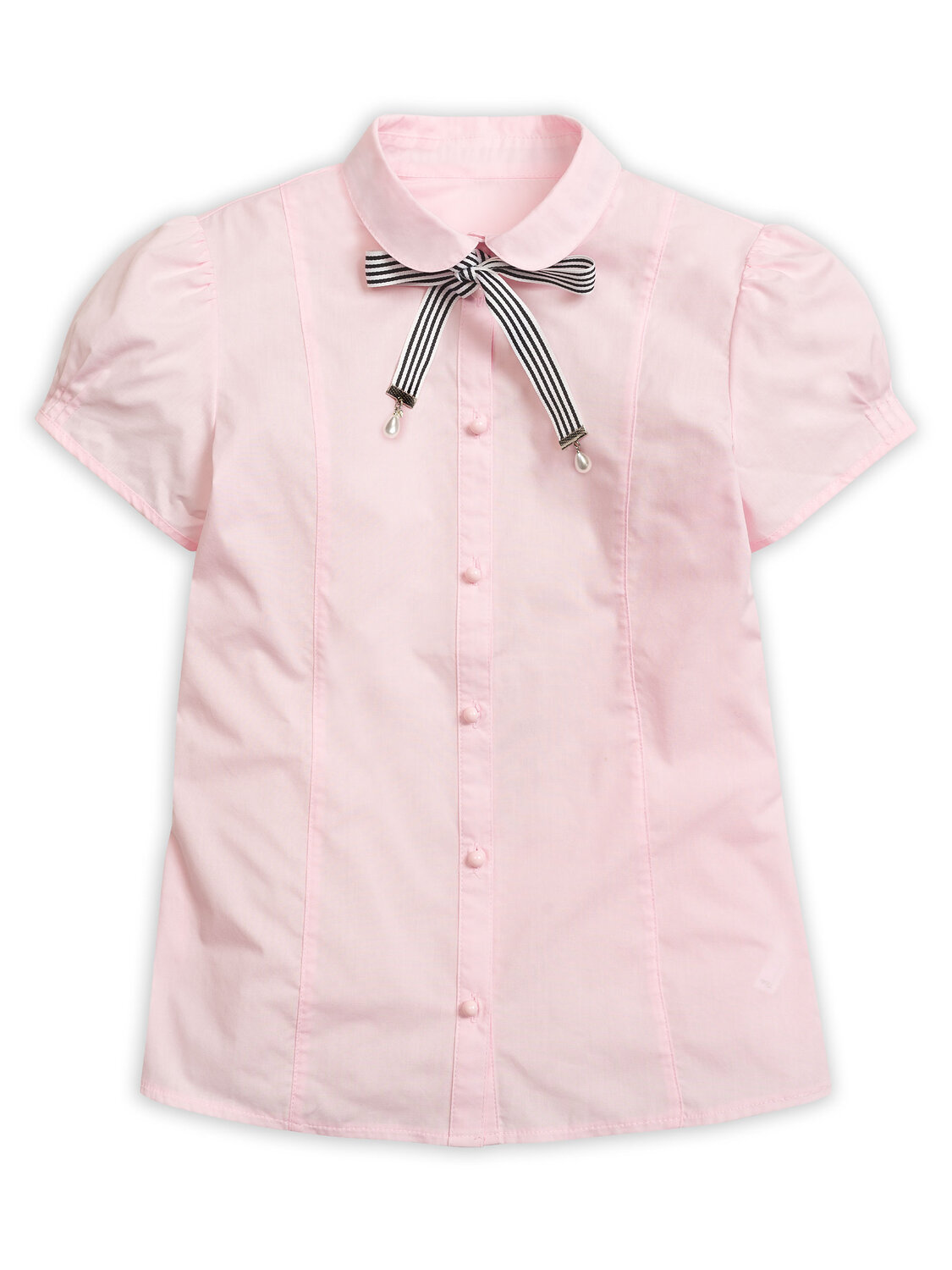 Блузка для девочек с коротким рукавом. Блузка классического полуприлегающего силуэта с рельефами по переду и спинке. Новая форма рукава с вертикальными защипами внизу и узкой манжетой. Под воротник на незаметную пуговку пристегивается съемная полосатая лента с жемчужинами на концах.