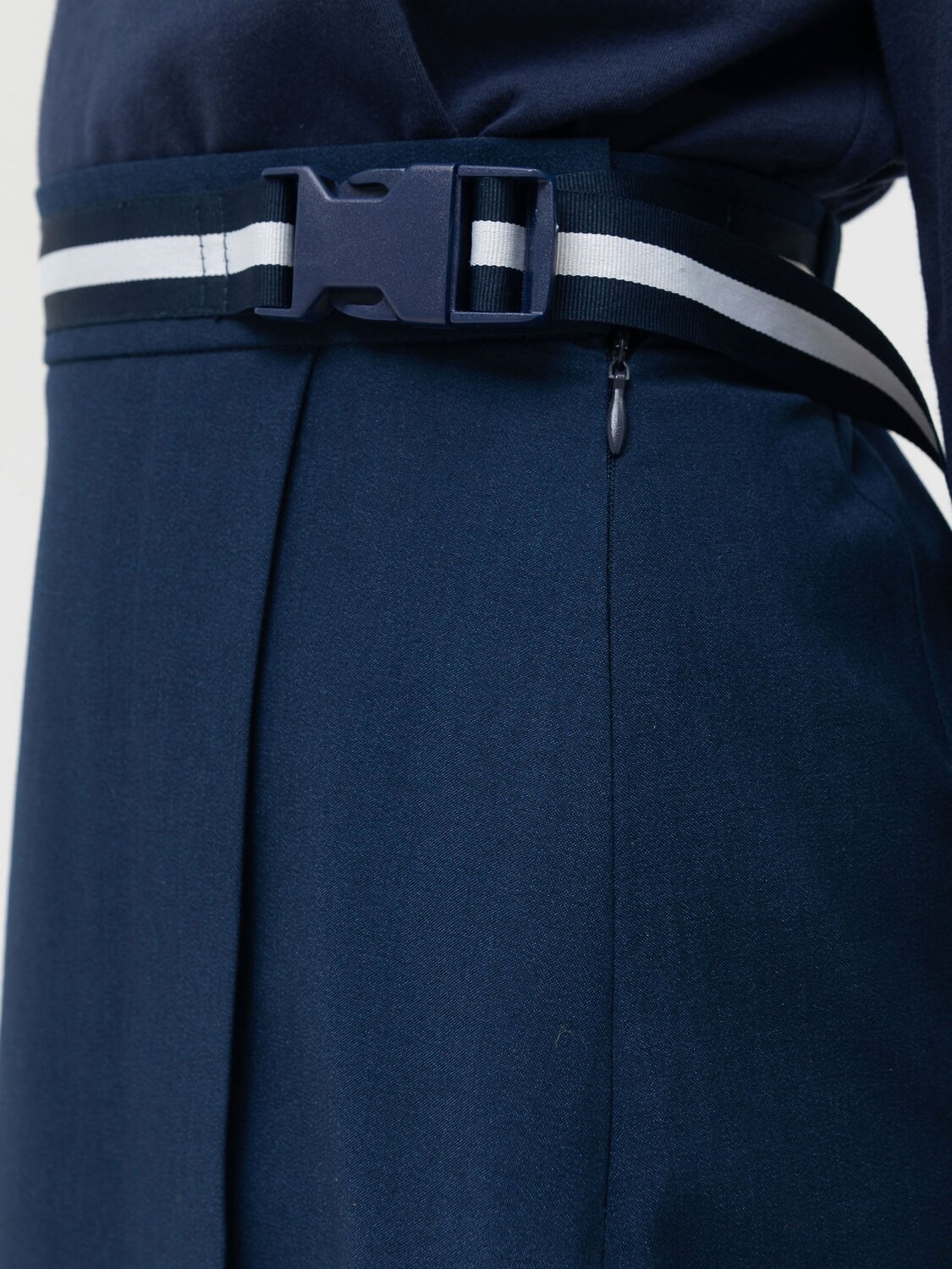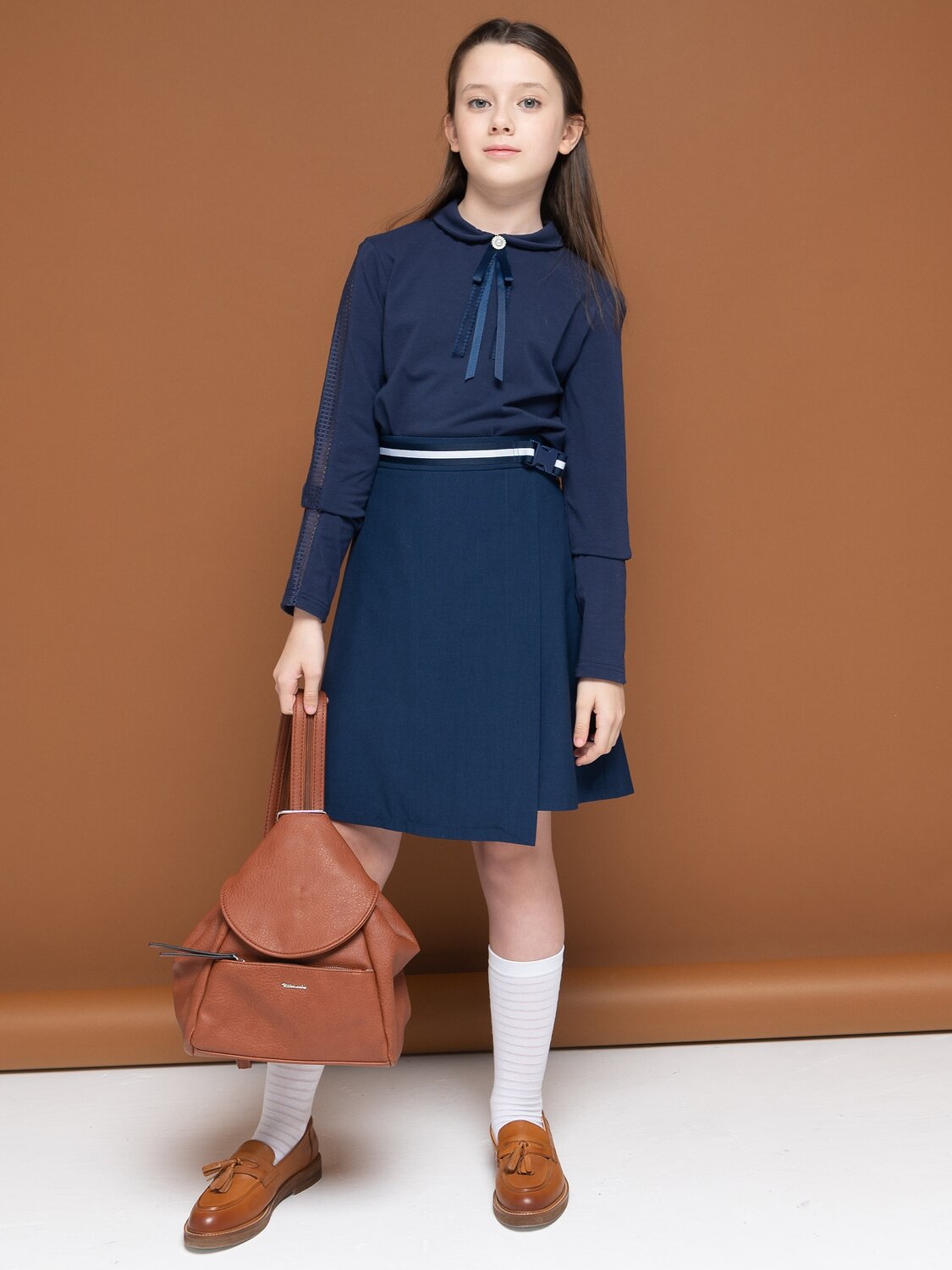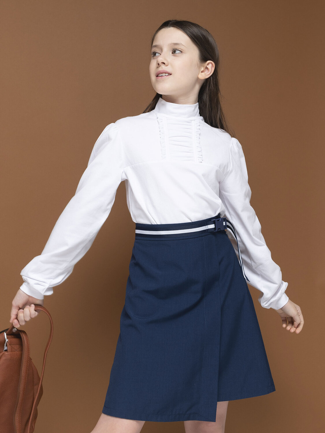 Юбка школьная из костюмной практичной ткани. Без подклада, с имитацией запАха спереди. Чтобы удобно было надевать, добавлены молния и пуговица. А пояс с регулировкой не передавливает живот. Стильный акцент модели декор с красивой тесьмой и удобной крепкой застежкой. Все это позволяет носить эту юбку не только в школу, но и в составе образов casual и спорт.