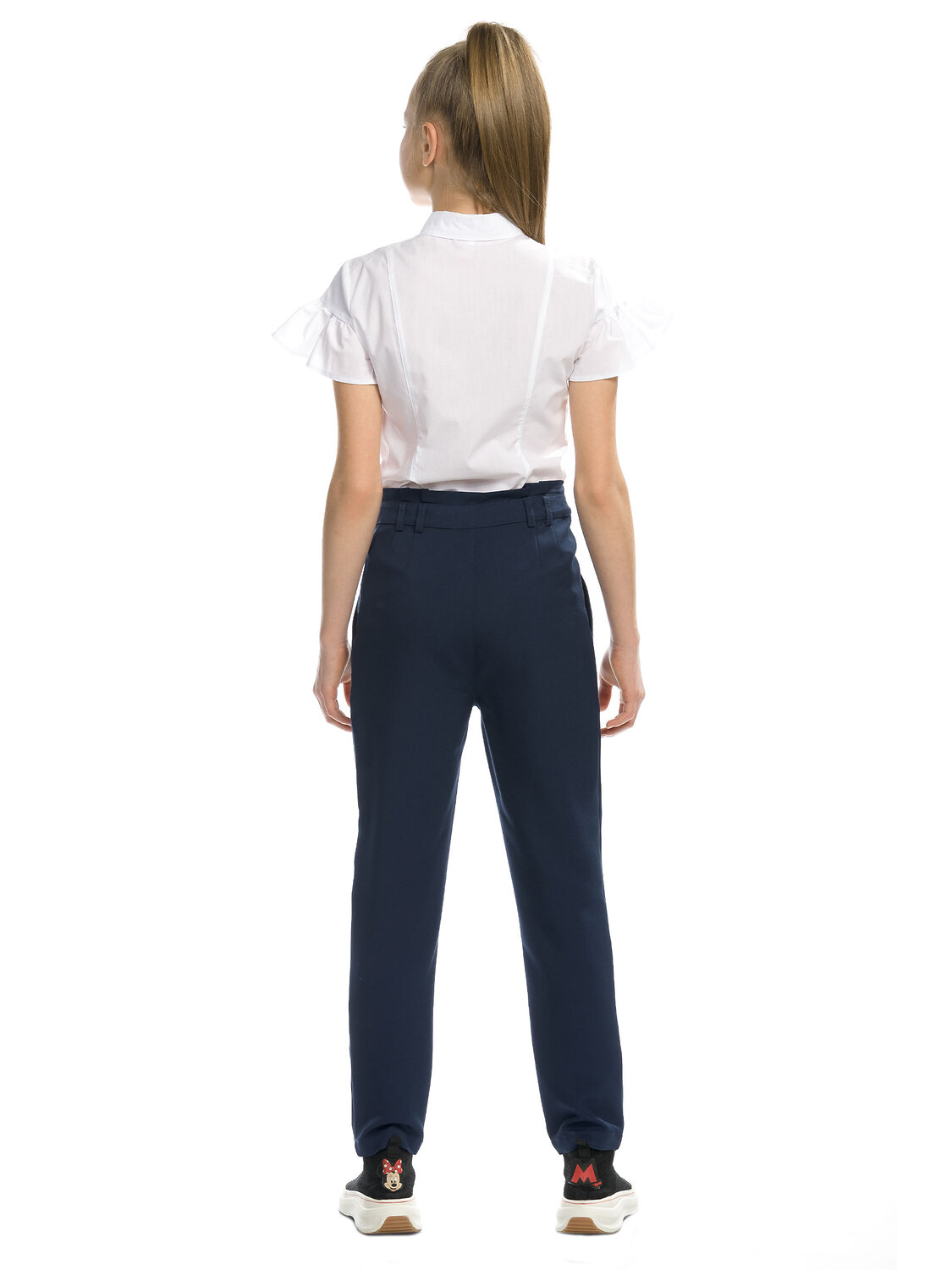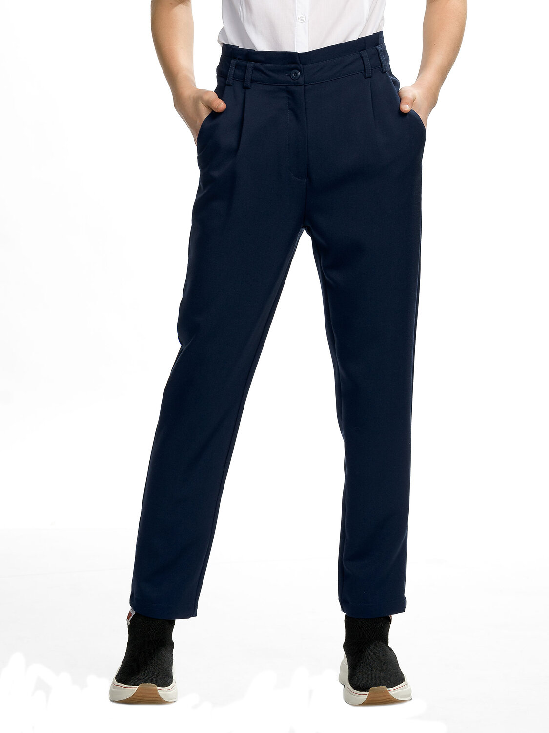 Швейные брюки для девочек, расширенные в области бёдер и зауженные книзу. Новинка. Талия на естественном месте. Спереди четыре складки. Боковые карманы, пояс со шлёвками, верхняя часть пояса с декоративной деталью со складками. Застежка на молнию спереди.