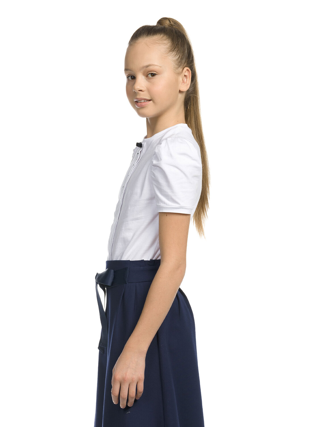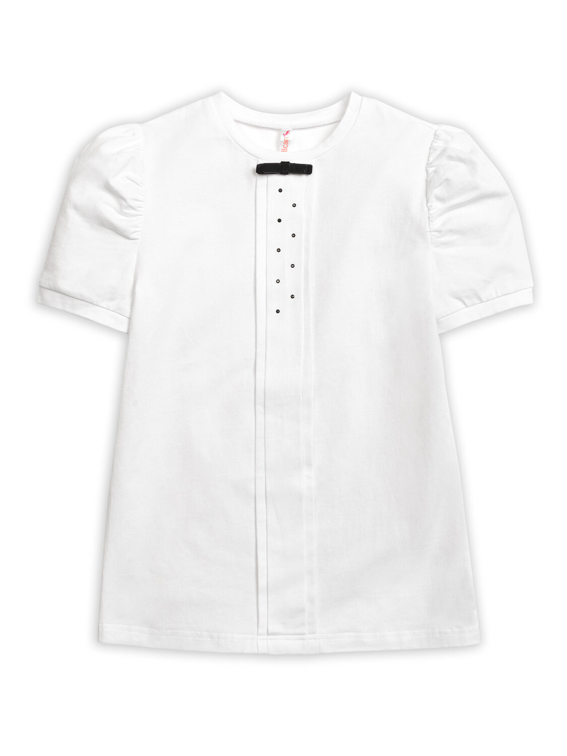 Футболка для девочек из мягкого хлопкового трикотажа с добавлением эластана. Полуприлегающий силуэт, рукава с объемом в верхней части. По центру переда застрочены складки, имитирующие планку. Декор в виде черных страз по центру и аккуратного бархатного бантика.