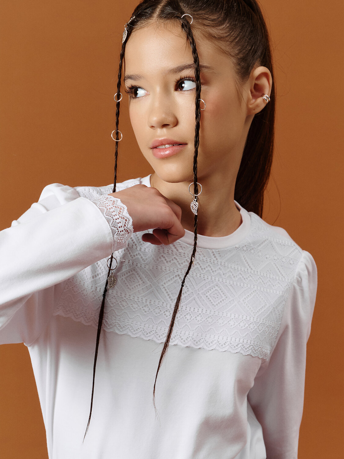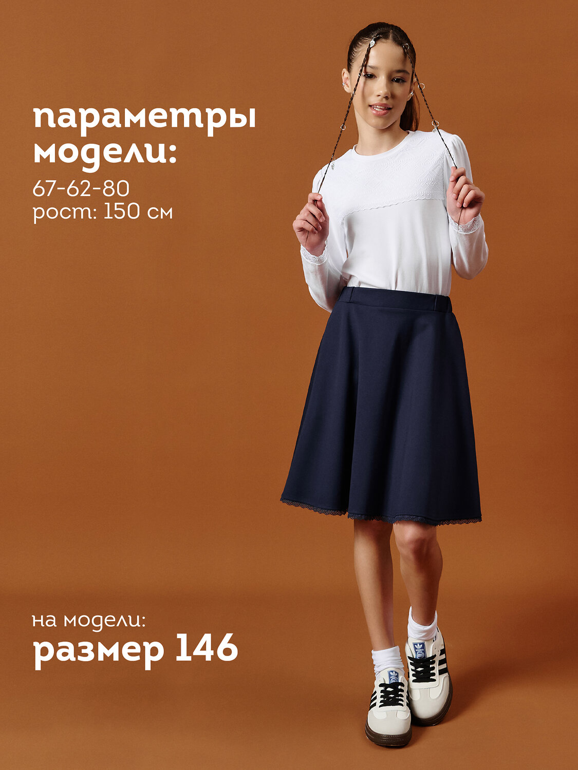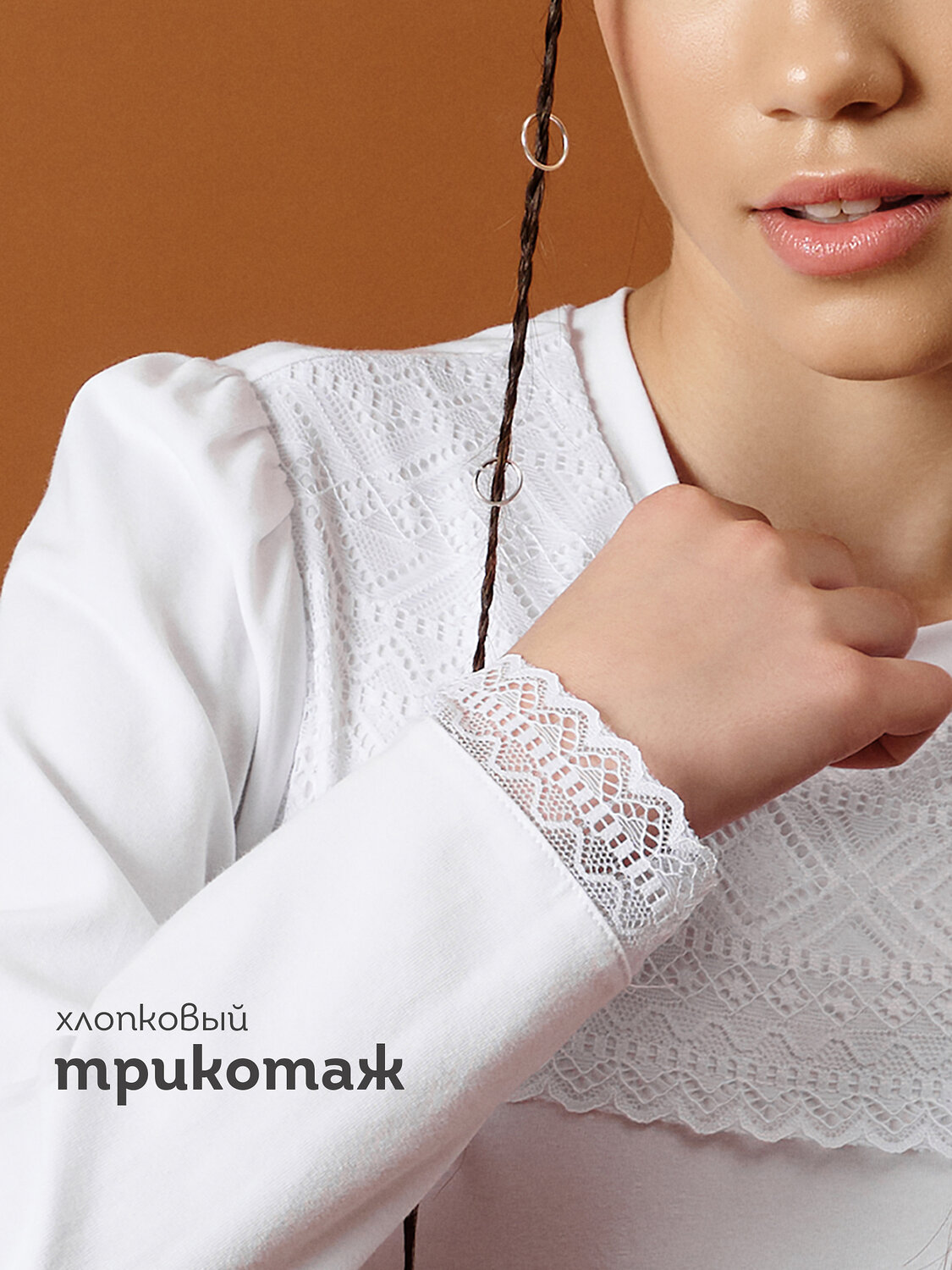 Эта трикотажная блузка для школы станет прекрасным выбором для девочек, сочетающим в себе стиль, комфорт и практичность. Модель небольшого объема аккуратно садится по фигуре и отлично смотрится под сарафан, жилет или школьный пиджак. Выполнена из мягкого, приятного к телу трикотажа, она идеально подходит для повседневной носки и торжественных мероприятий в школе. Спереди настрочено широкое кружево, придающее образу нарядность и утончённость. Длинные рукава оформлены небольшой сборочкой по верху, что добавляет легкости и мягкости силуэту, а по низу украшены узкой кружевной манжетой. Такая модель не только удобна в течение всего учебного дня, но и не требует особого ухода — блузка легко стирается, не теряет форму и сохраняет аккуратный внешний вид. Подходит для начальной и средней школы, отлично сочетается с юбками, брюками и школьными сарафанами. Это универсальная блузка школьная для девочки, которая подчеркнёт опрятный образ и станет любимой вещью в гардеробе. Используйте таблицу размеров на фотографии, чтобы выбрать подходящий размер. Обратите внимание, что цвет товара на экране вашего устройства может отличаться от реального.