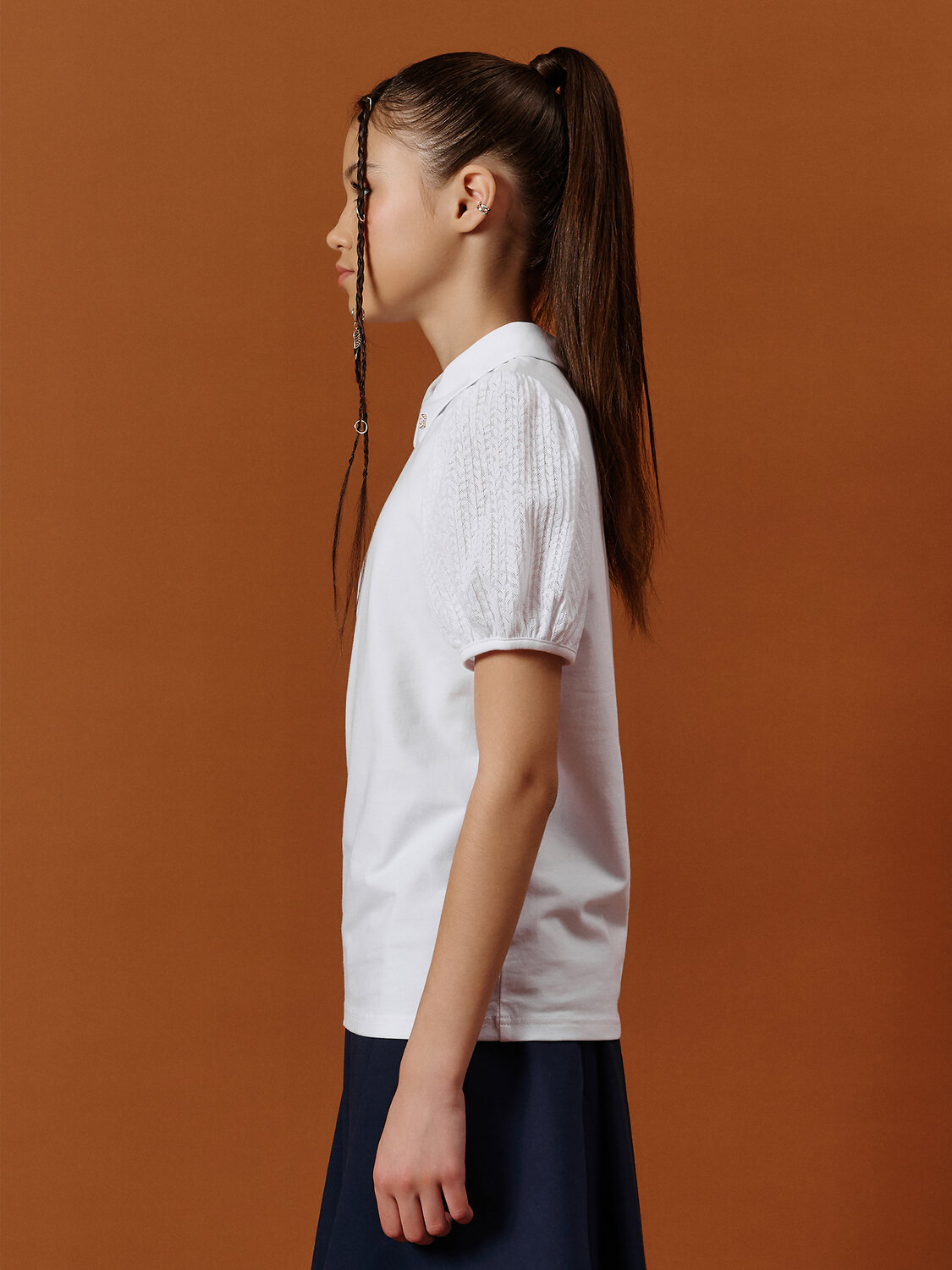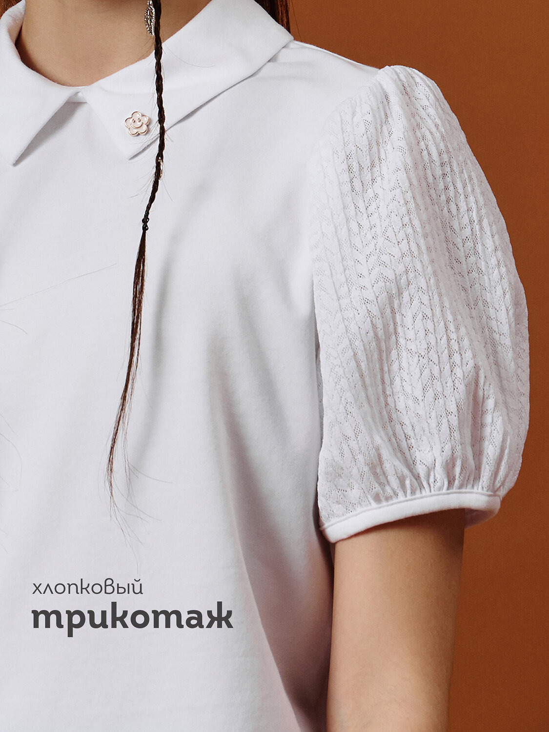 Ищете удобную и красивую блузку для школы, которая понравится и маме, и ребёнку? Эта модель — отличный выбор! Блузка изготовлена из мягкого хлопкового трикотажа с добавлением эластана, поэтому она отлично тянется и не сковывает движений — ребёнку будет комфортно в течение всего школьного дня. Короткие рукава из лёгкого гофрированного кружева добавляют лёгкости и нежности образу, а аккуратная сборка по плечам и низу рукавов делает их воздушными и стильными. Воротник создаёт аккуратный и опрятный вид — идеально для школьного дресс-кода. Заботимся о простоте: сзади сделан удобный разрез, чтобы блузку легко надевать через голову, а застёжка на воротнике с двумя пуговицами и мягкими резиновыми петлями позволяет легко ее застегнуть даже ребенку начальных классов. Эта блузка — универсальный выбор для школы, которая прослужит долго благодаря качественным материалам и продуманному дизайну. Она легко сочетается с юбками, брюками и сарафанами, а ещё — благодаря стильному кружеву — смотрится красиво и нарядно, поэтому подходит не только для уроков, но и для школьных праздников и мероприятий. Кроме того, блузка очень проста в уходе — её можно легко стирать и гладить, сохраняя форму и свежий вид даже после многих стирок. Используйте таблицу размеров на фотографии, чтобы выбрать подходящий размер. Обратите внимание, что цвет товара на экране вашего устройства может отличаться от реального.