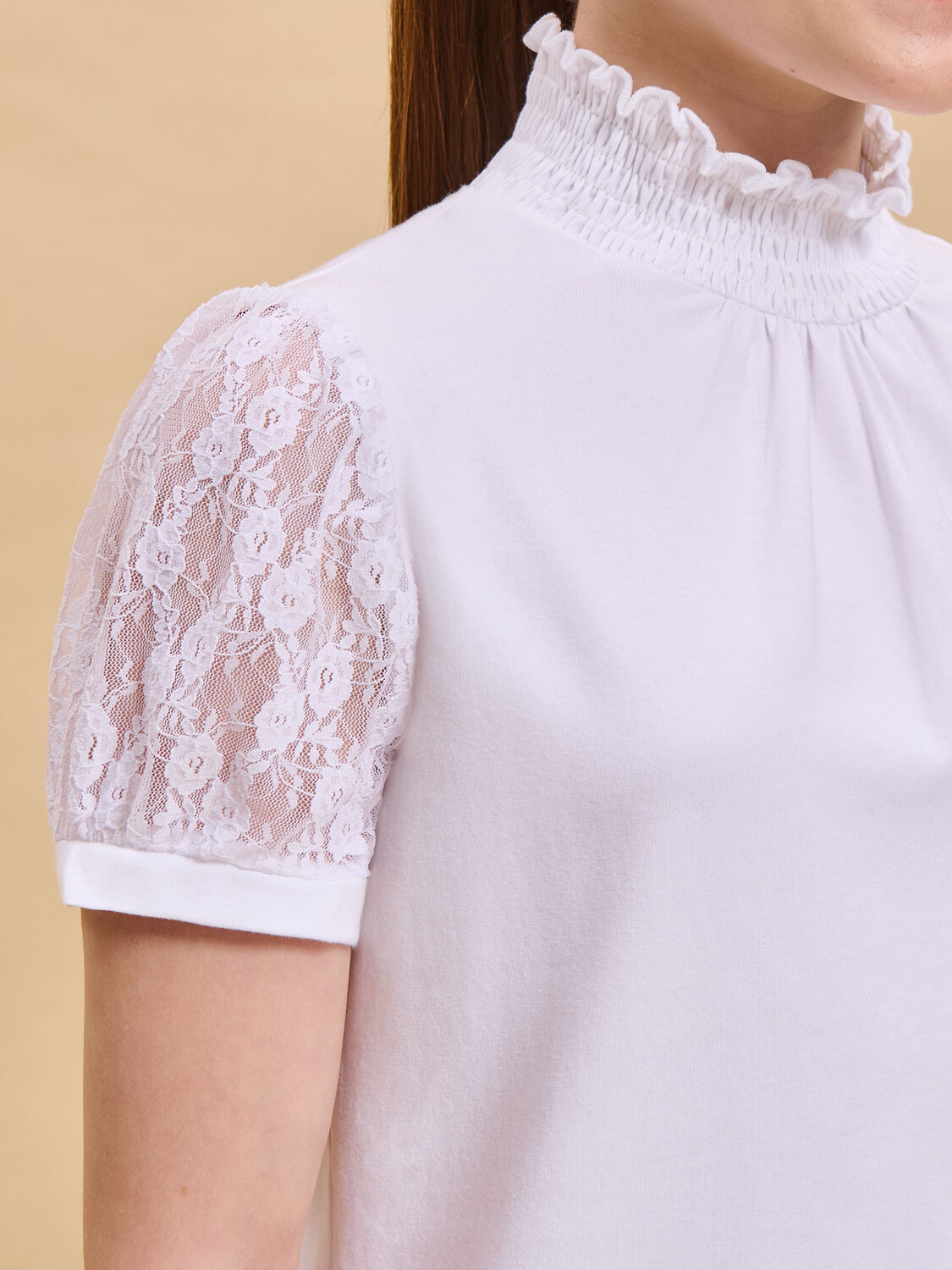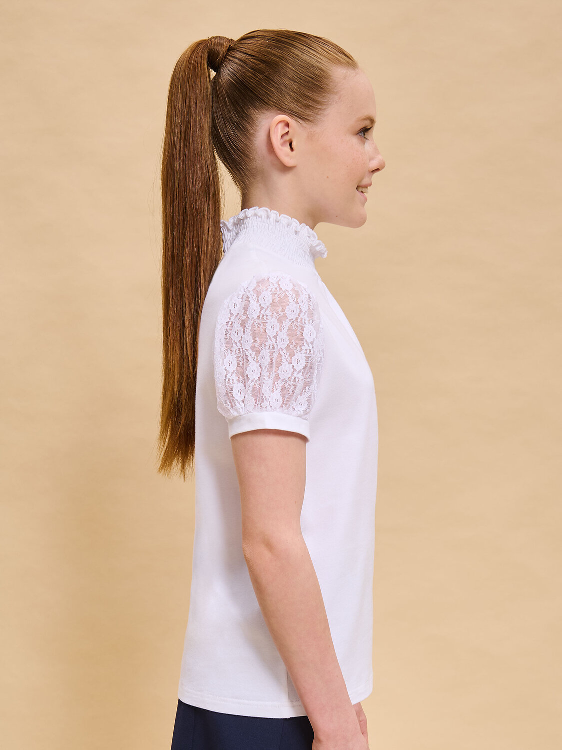 Школьная блузка с кружевными рукавами для девочки. Комфортная и мягкая трикотажная блузка умеренного объёма хорошо садится на девочек с разной фигурой и не сковывает движений ребёнка. Рукава выполнены из оригинального кружевного эластичного полотна с нежным девичьим узором. По низу рукавов узкие манжеты из основного материала. Блузка дополнена воротником-стойкой с эластичной сборкой — удобно надевать и при этом элегантно смотрится. По переду модель декорирована небольшой деликатной сборкой. В составе ткани преобладает качественный хлопок — ребёнку не жарко, кожа дышит. Благодаря полиамиду блузка в школу для девочки хорошо сохраняет форму и первозданный внешний вид. Модель однотонная, без принта. В ассортименте представлены блузки для девочек школьные универсальных цветов. Они легко сочетаются с различными брюками, юбками, сарафанами. Блузка детская подходит как для повседневной носки в школу, так и для более торжественного случая — в зависимости от того, с чем её надеть. Отличный выбор школьной формы для вашей девочки. Помните о правильном уходе за изделием: рекомендуется стирать при температуре не выше 30 °C, без предварительного замачивания, с изнанки. Это поможет сохранить качество и цвет блузки на долгое время. Не забывайте о выборе правильного размера. Используйте таблицу размеров на фотографии, чтобы выбрать подходящий вариант. Обратите внимание, что цвет товара на экране вашего устройства может отличаться от реального.