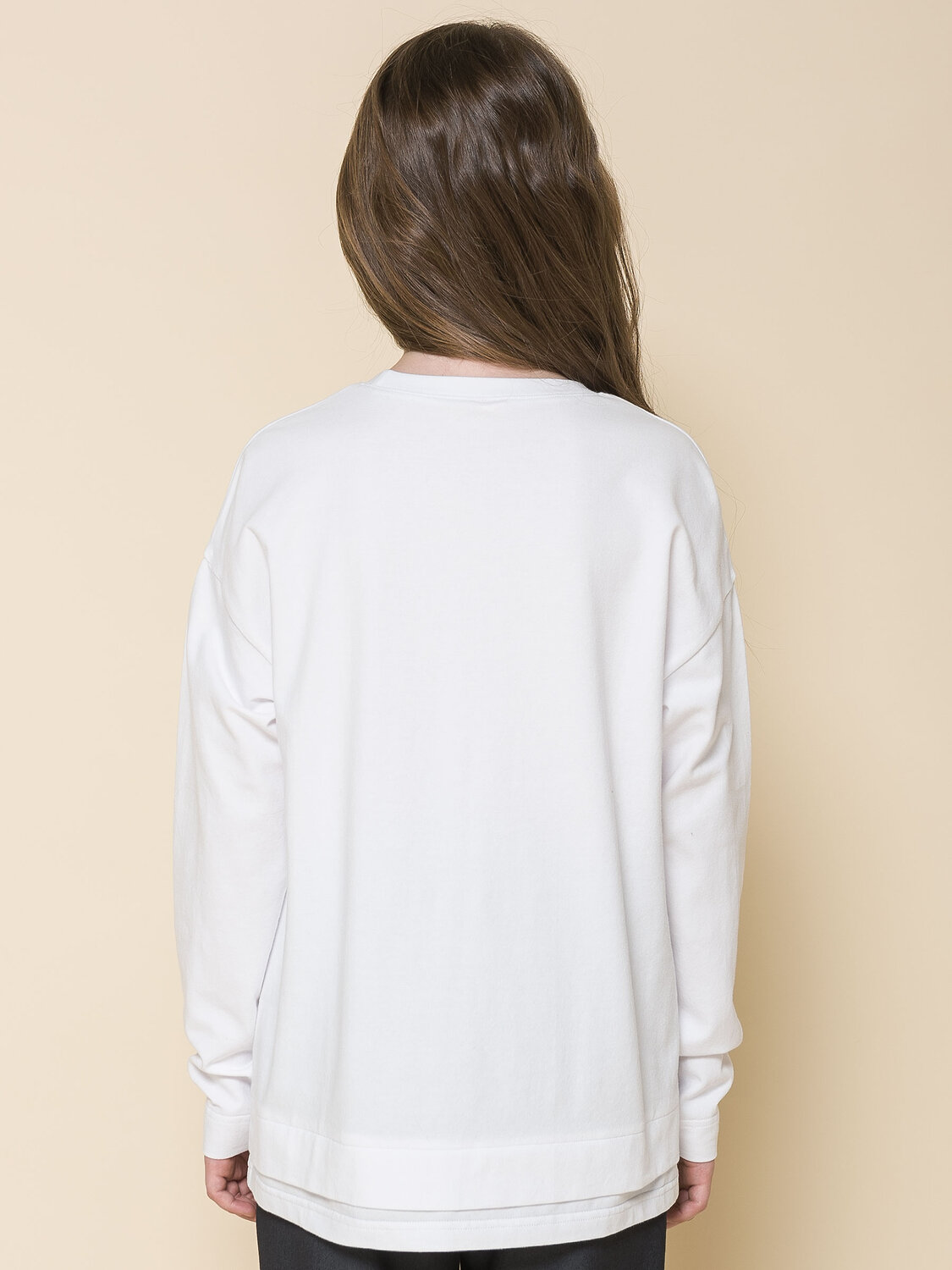Трикотажный джемпер легкого А-силуэта со спущенным плечом для девочки. В составе ткани преобладает хлопок — модель дышащая, мягкая и приятная на ощупь. Эластан помогает сохранять форму даже после частых стирок. Объемный крой, спущенное плечо – настоящий трендовый оверсайз. В лонгсливе комфортно в течение всего дня, ничего не давит, не колет, не сковывает движения. Рукав книзу заужен — красиво садится по руке. Оригинальный крой создаёт эффект многослойности, двух надетых друг на друга изделий — один из актуальных модных трендов. Изюминка модели — ассиметричный боковой шов, украшенный деликатными кнопками в тон. Такой джемпер можно брать на вырост — благодаря увеличенному объёму он долго не станет малым. Отличный вариант модной школьной формы для девочек.