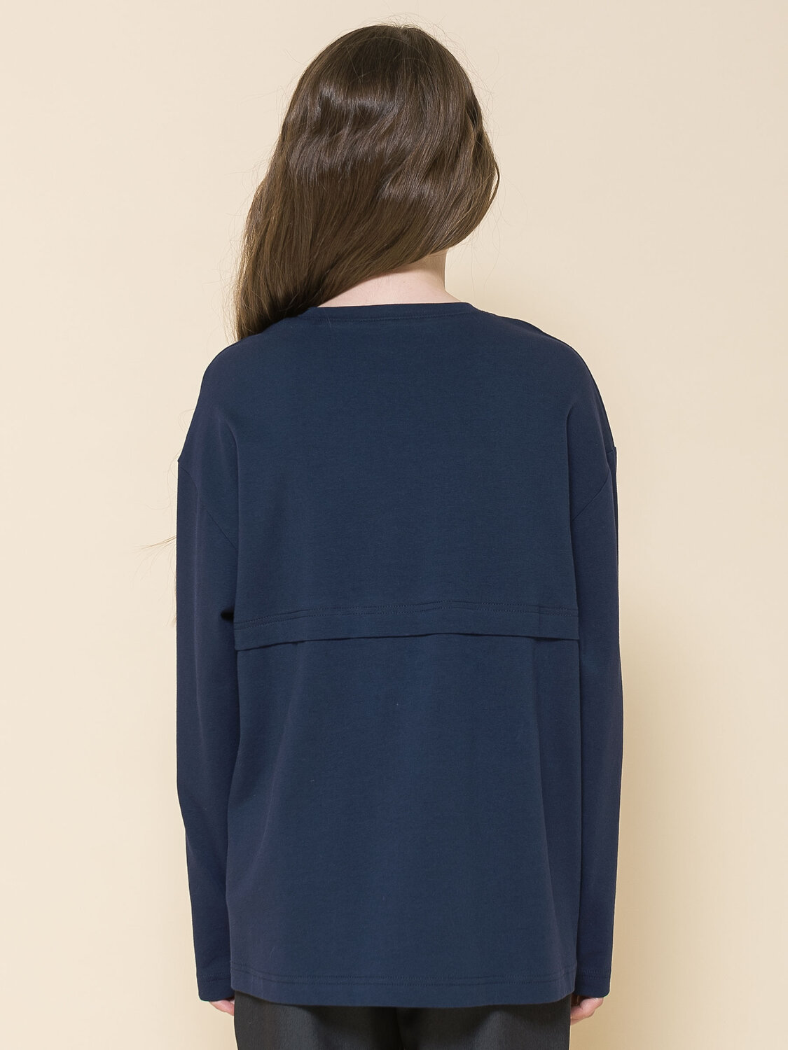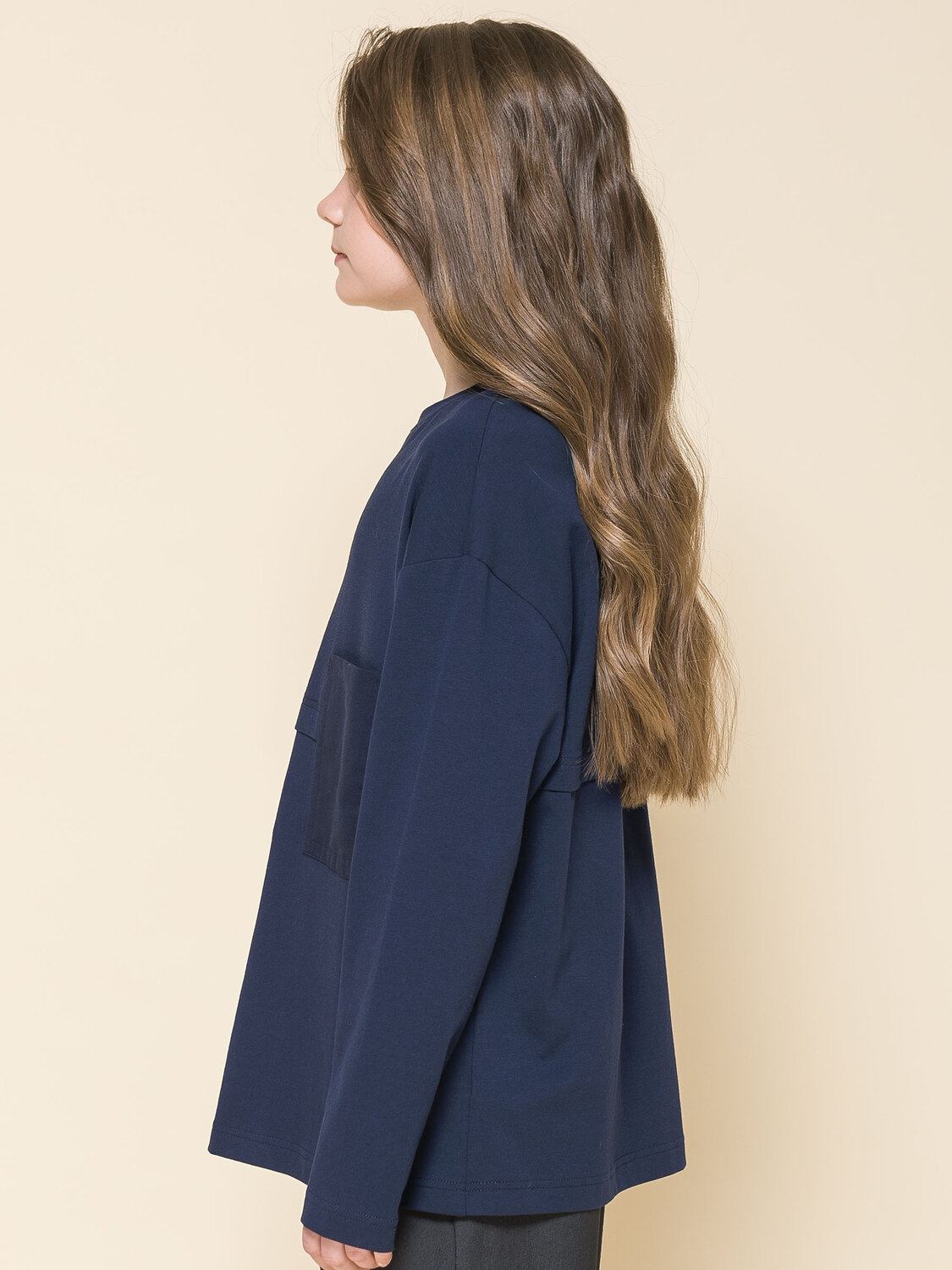Лонгслив свободного силуэта со спущенным плечом для девочки. В составе ткани преобладает хлопок – изделие дышащее, приятное на ощупь и комфортное для ребёнка. Эластан помогает сохранять форму даже после частых стирок. Имитация кокетки спереди и сзади и накладной карман — актуальный модный тренд. Благодаря силуэту оверсайз джемпер словно «растёт» вместе с ребёнком, поэтому его хватит надолго. Подходит девочкам с разными типами фигуры. Модный и практичный вариант одежды для школы.