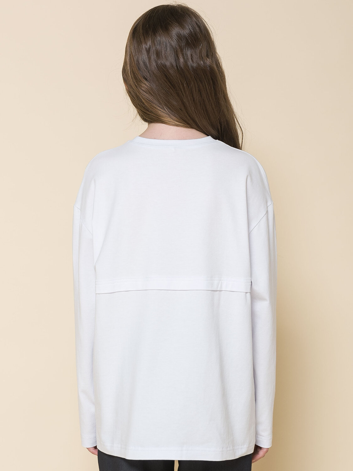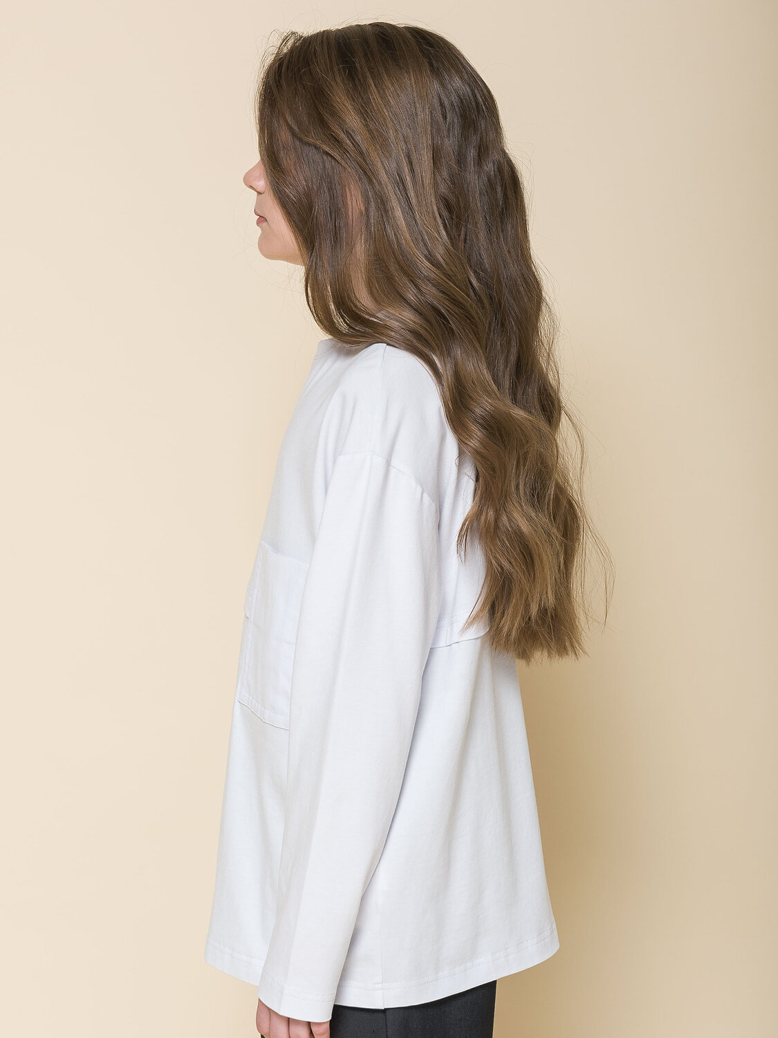 Лонгслив свободного силуэта со спущенным плечом для девочки. В составе ткани преобладает хлопок – изделие дышащее, приятное на ощупь и комфортное для ребёнка. Эластан помогает сохранять форму даже после частых стирок. Имитация кокетки спереди и сзади и накладной карман — актуальный модный тренд. Благодаря силуэту оверсайз джемпер словно «растёт» вместе с ребёнком, поэтому его хватит надолго. Подходит девочкам с разными типами фигуры. Модный и практичный вариант одежды для школы.
