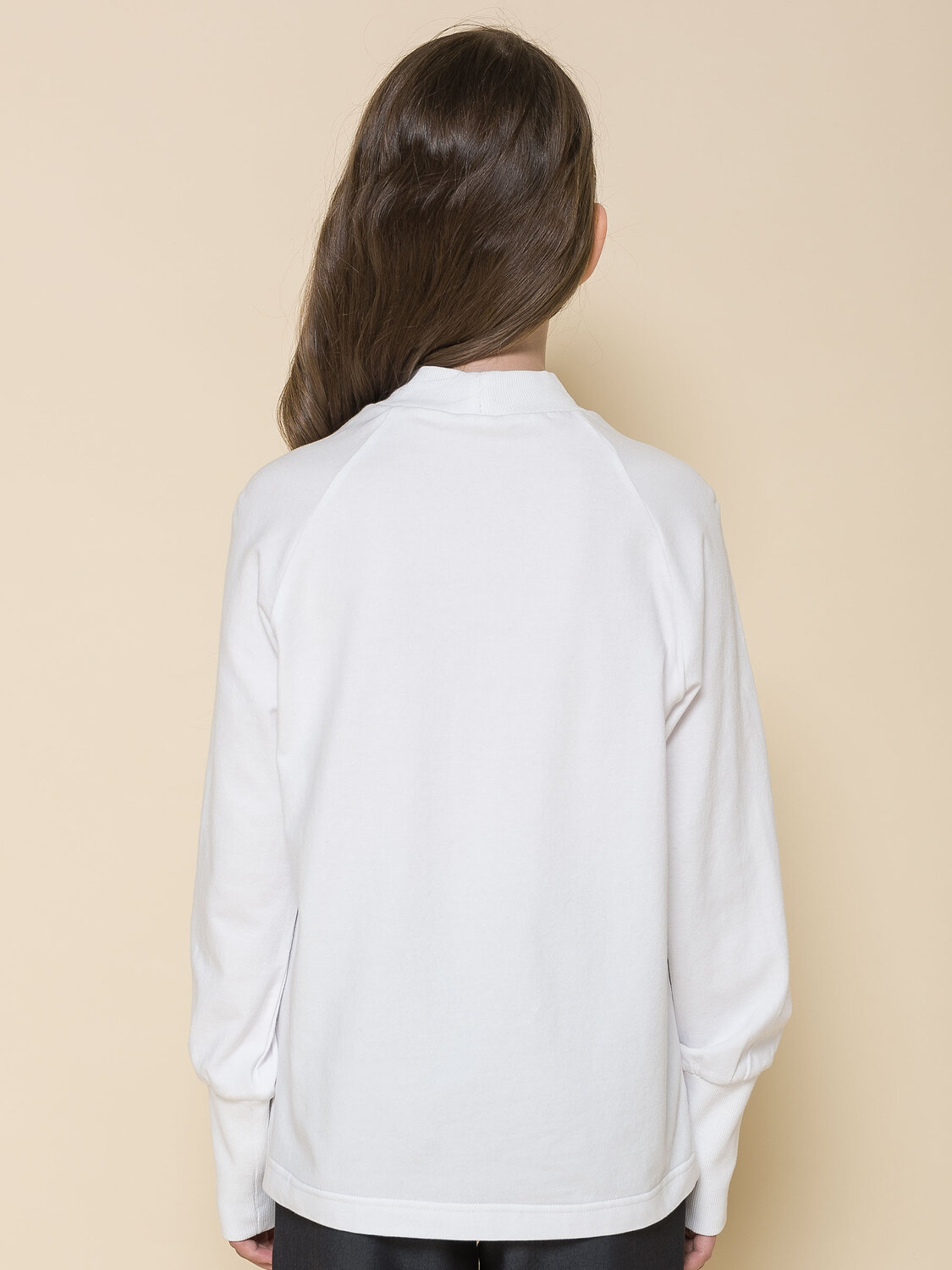 Водолазка с рукавами кроя реглан для девочки. Преобладающий в составе ткани хлопок делает эту модель мягкой, дышащей и комфортной для ребёнка. Эластан помогает изделию не терять форму даже после частых стирок. В джемпере комфортно в течение всего дня, ничего не давит, не колет, не сковывает движения. По переду водолазку украшает небольшой позитивный принт - изюминка модели. Воротник-стойка и низ рукавов выполнены из рибаны — водолазку удобно надевать и снимать, а также рибана долго сохранят форму. Широкая обработка низа рукавов — один из актуальных модных трендов и есть запас по длине рукава. Модель лаконичного дизайна, легко сочетается и с юбками, и с брюками. Отличный вариант формы для школы.