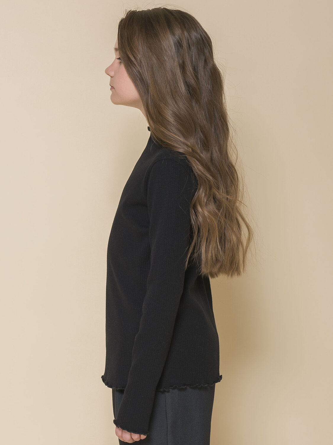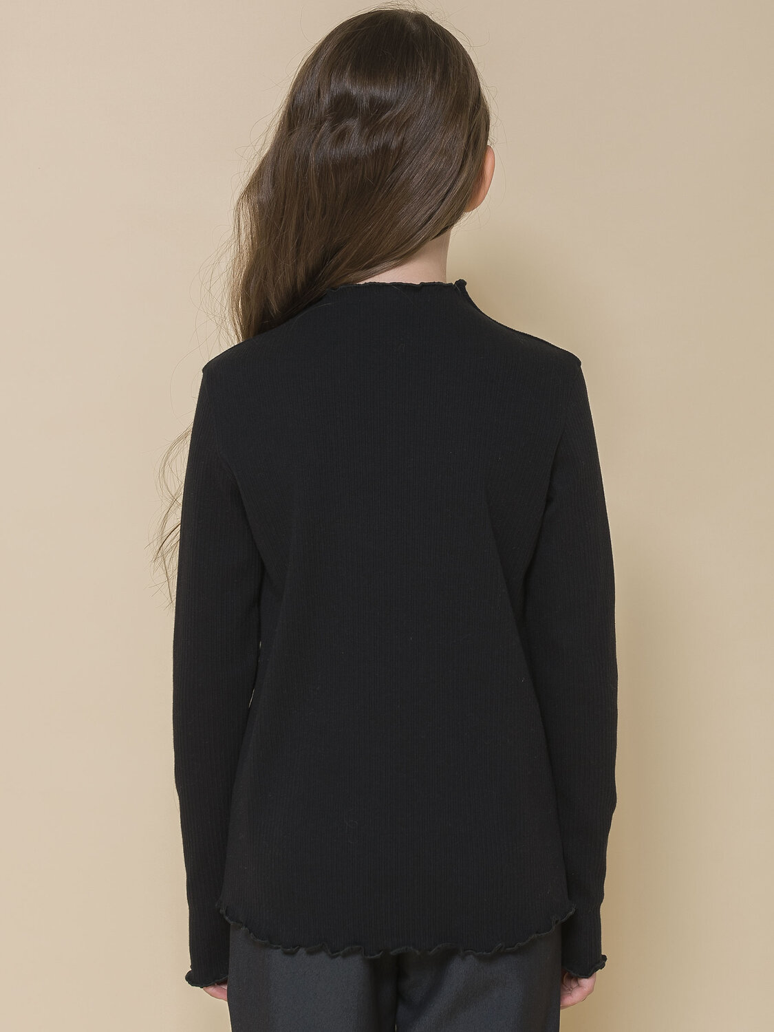 Водолазка из модной ткани в рубчик для девочки. В составе ткани 95% хлопка — изделие мягкое, тактильно приятное и комфортное для кожи ребенка. Эластан помогает сохранять форму даже после частных стирок. Модель лаконичного дизайна украшает декоративная обработка «салатный край» по горловине, низу и краям рукавов — элегантно и стильно. Модный и практичный вариант для школьной одежды: водолазка хорошо сочетается как юбками, сарафанами, так и с брюками.