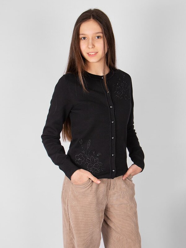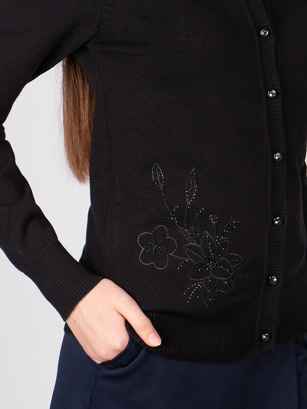 Элегантный кардиган на пуговицах, декорированный стразами и вышивкой.